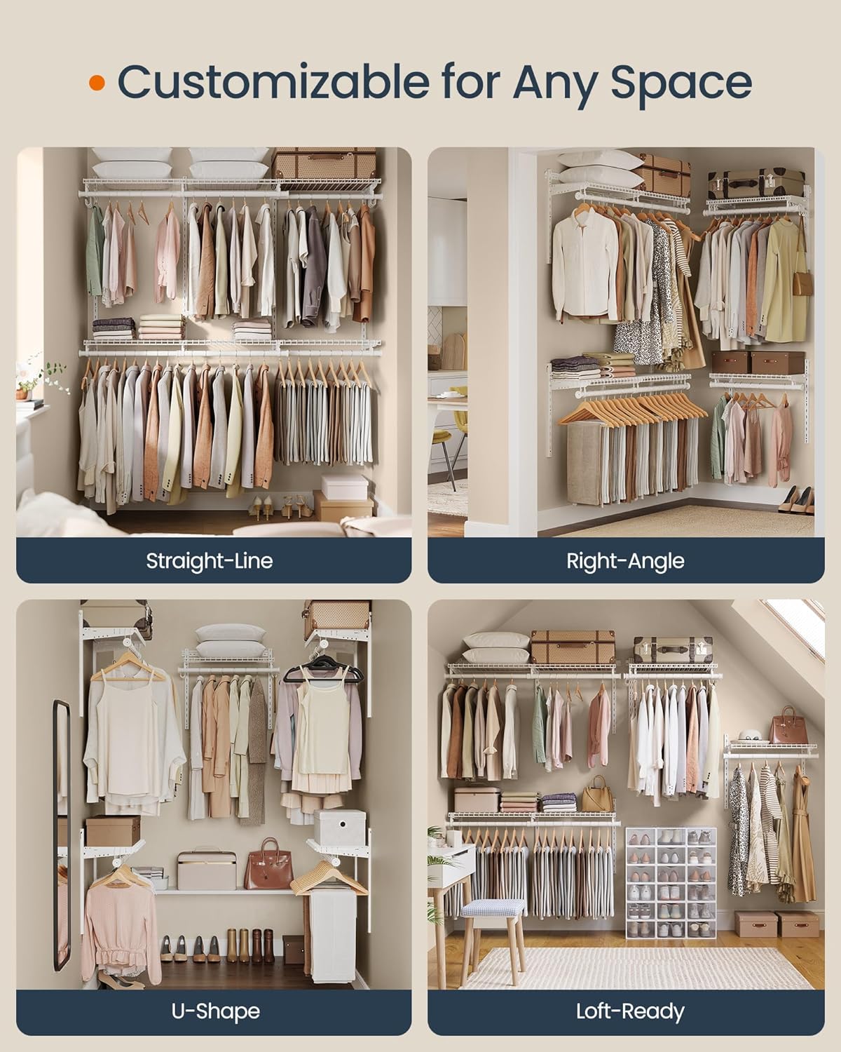 Optimized Storage Space: Elevate your wardrobe with a versatile closet system with segment storage designed to enhance organization. Make the most of your space with a system that adapts to your needs