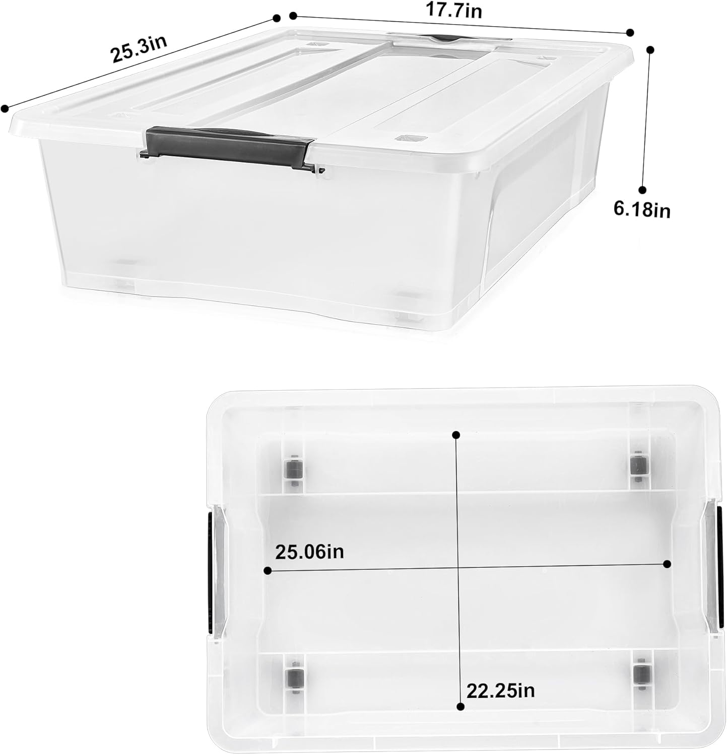 The Sorbus Storage Bins with Lids are perfect for keeping your home organized. Featuring a clear, stackable design, they allow for easy visibility and quick access to your items while being ideal for under-bed storage. These Multifunctional Storage Solutions are versatile enough to store seasonal clothes, holiday decorations, linens, shoes, toys, office supplies, and more. Whether used in bedrooms, closets, garages, or dorm rooms, they serve as totes for storage, storage boxes, plastic containers with lids, and heavy-duty storage bins. The Secure and Sealed Storage protects your belongings with tightly sealed lids that keep out dust and moisture. The secure snap-on lids ensure your items stay safe and protected, making these bins perfect for storing delicate items, seasonal clothes, or important documents. Made from high-quality, BPA-free plastic, the Sturdy and Reliable Construction of these stackable storage bins ensures they withstand everyday use while maintaining their shape and durability. Each storage bin measures 25.3” L x 17.7” W x 6.18” H.