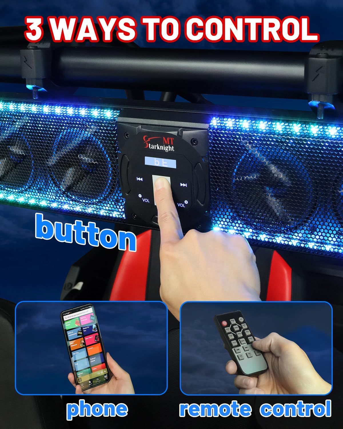 BEAT-SYNC LIGHT: StarknightMT utv sound bar features RGB Multi-color lighting that can be set to 5 different light modes(Rhythmic,Fading,Solid,jumping,OFF), the dynamic light mode is synchronized with the music; We design a cool lightning bolt shape to the exterior of the speaker, in addition to lighting you up while driving at night, it will look even cooler at night, making your trip more fun and noticeable