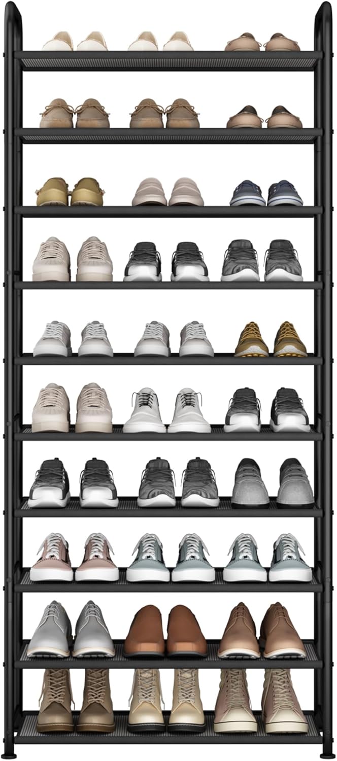 STO STO 10-Tier Shoe Rack with Sturdy Mesh Shelves, Tall Metal Shoe Organizer for Entryway, Closet, Garage, Front Door, Holds 30 Pairs, Free Standing Large Shoe Storage Shelf, Adjustable Feet, Black