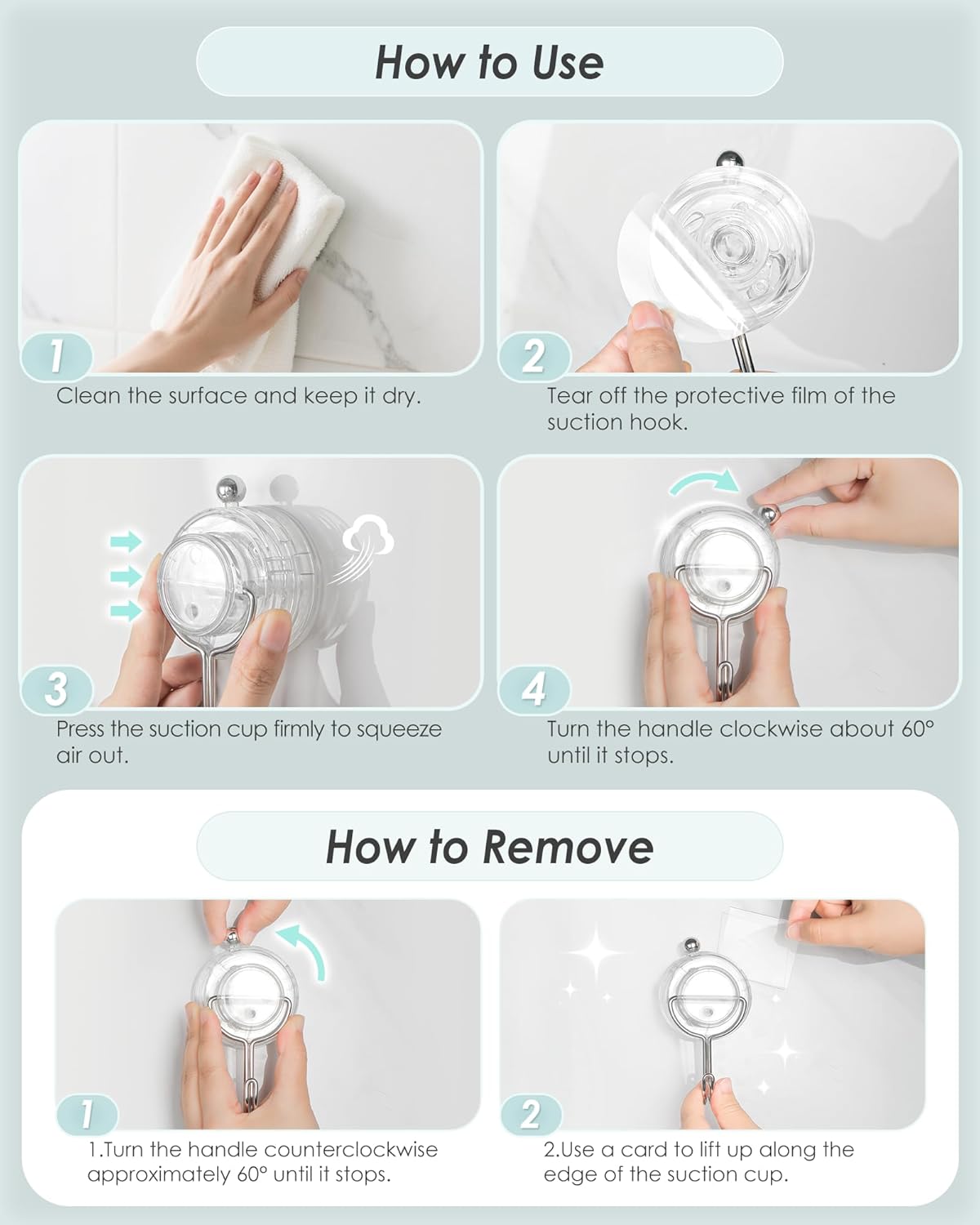 2025 New Design: Our shower suction cup hook features an ultra-strong clear adhesive silicone base paired with advanced vacuum suction technology, and a stainless steel hook, waterproof and rust-proof. Lasts for years. Transparent style, suitable for any decor style, practical addition to your home