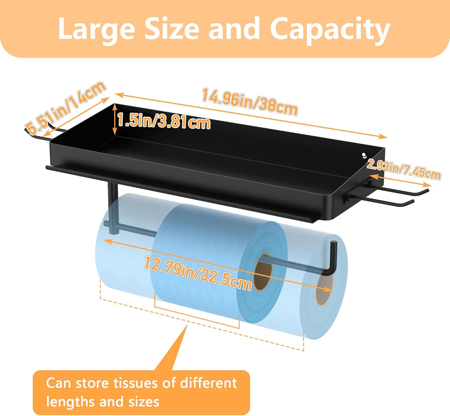 【Large size and capacity】The available length of the paper towel holder is 12 inches, which can accommodate both small and large tissues, providing enough space for the paper roll to roll smoothly.The shelf size is 15 inches x 6 10/5 inches x 1 12/2 inches, with a large capacity to store your garage accessories and other items.