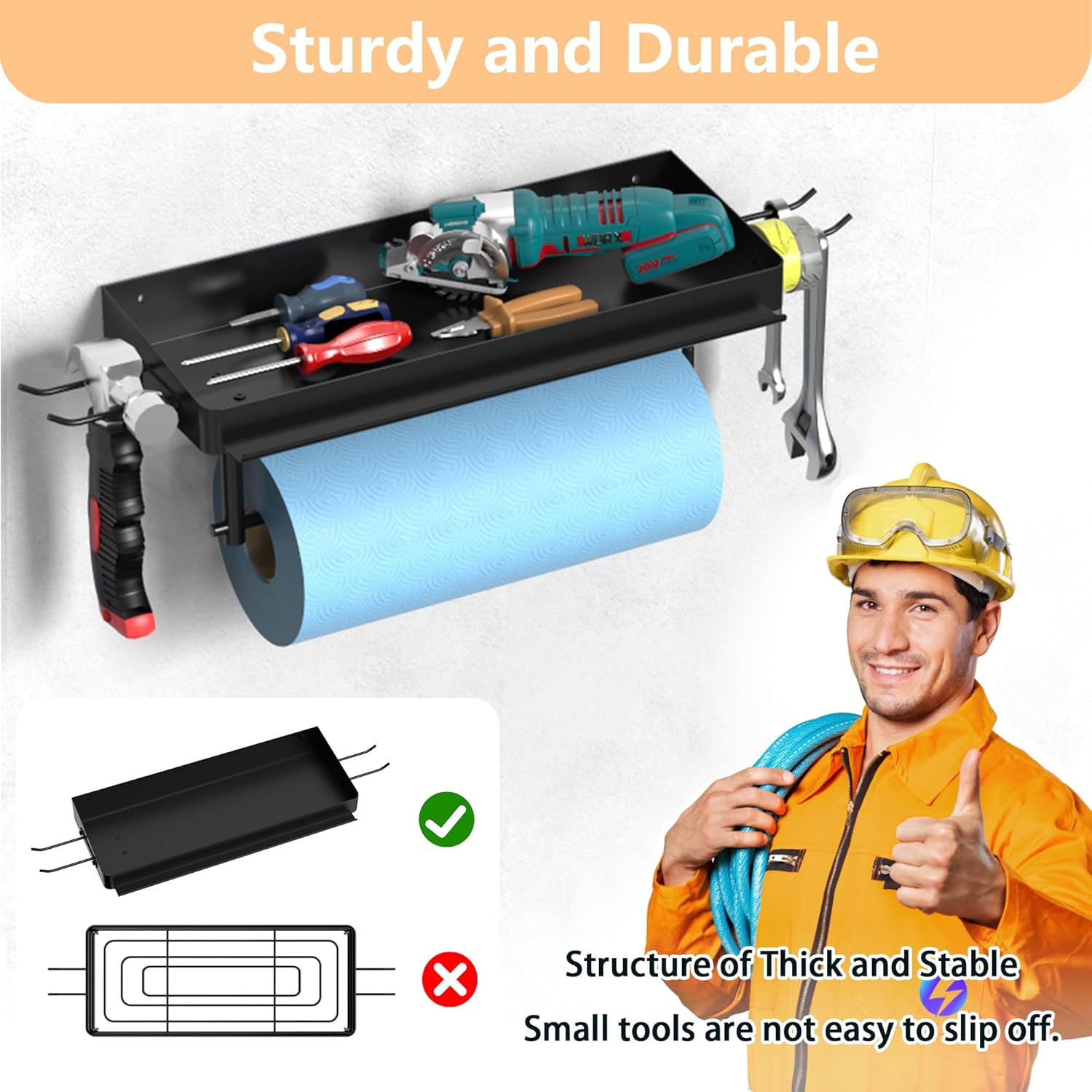 【Multi functional use】 The front of the shelf can also hold mobile phones, tablets, pens, and more.The wall mount paper towel holder is not only suitable for garages, but can also be used in workshops, miscellaneous rooms, craft rooms, kitchens, and other places. It can store automotive supplies, cleaning supplies, various kitchen supplies, and more garage accessories.