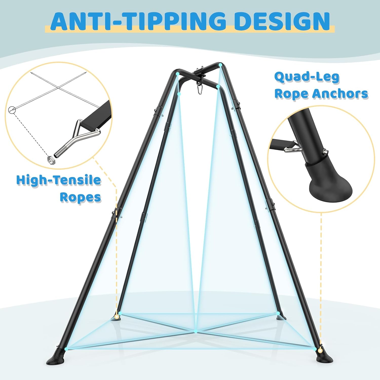 Swing Set: The base of sensory swing with stand features a criss-cross design with 2 straps between each base leg, and the X-shaped base has a larger contact area with the ground to ensure stability