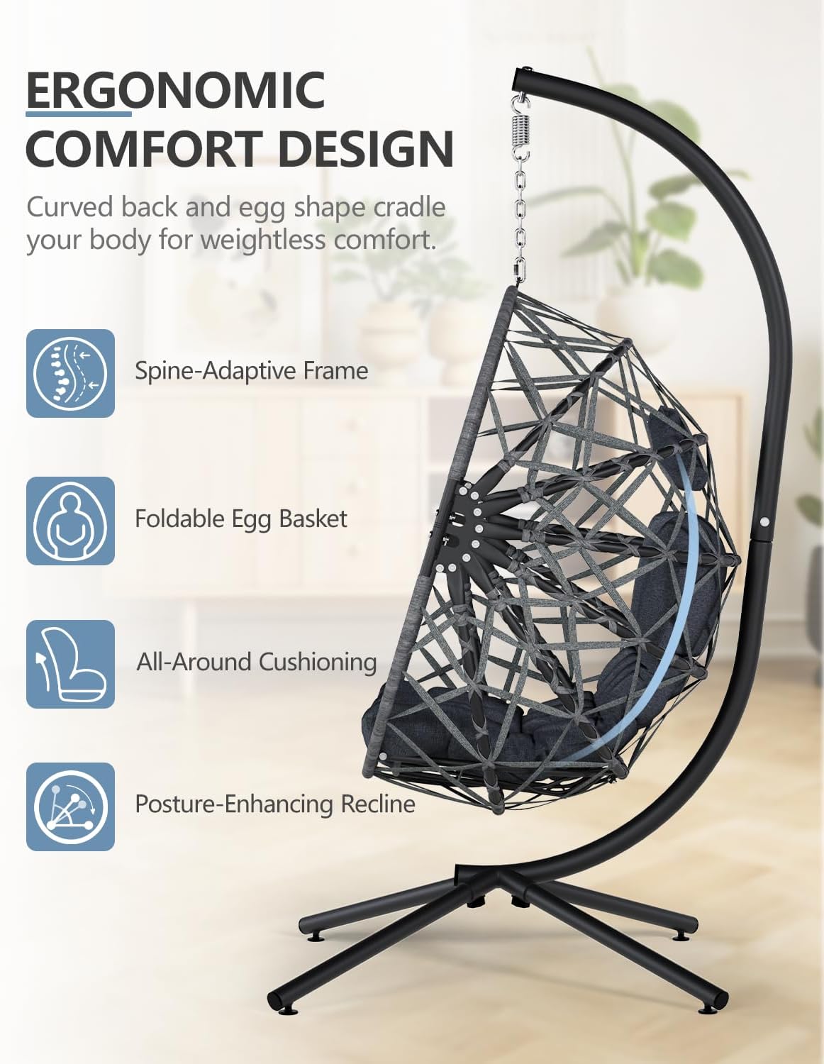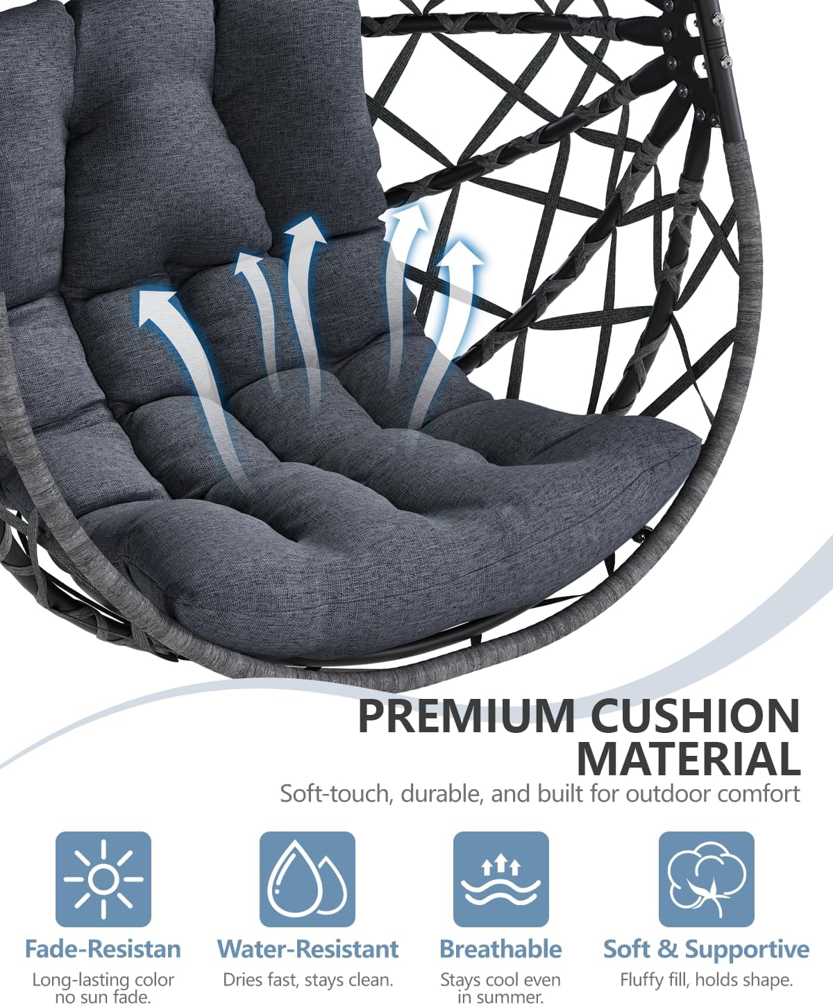 Oversized Comfort: Relax in a spacious 37.4″ x 35.4″ egg swing chair with stand. Thick cushions and ergonomic support make this SWITTE egg swing chair your cozy go-to—indoors or out