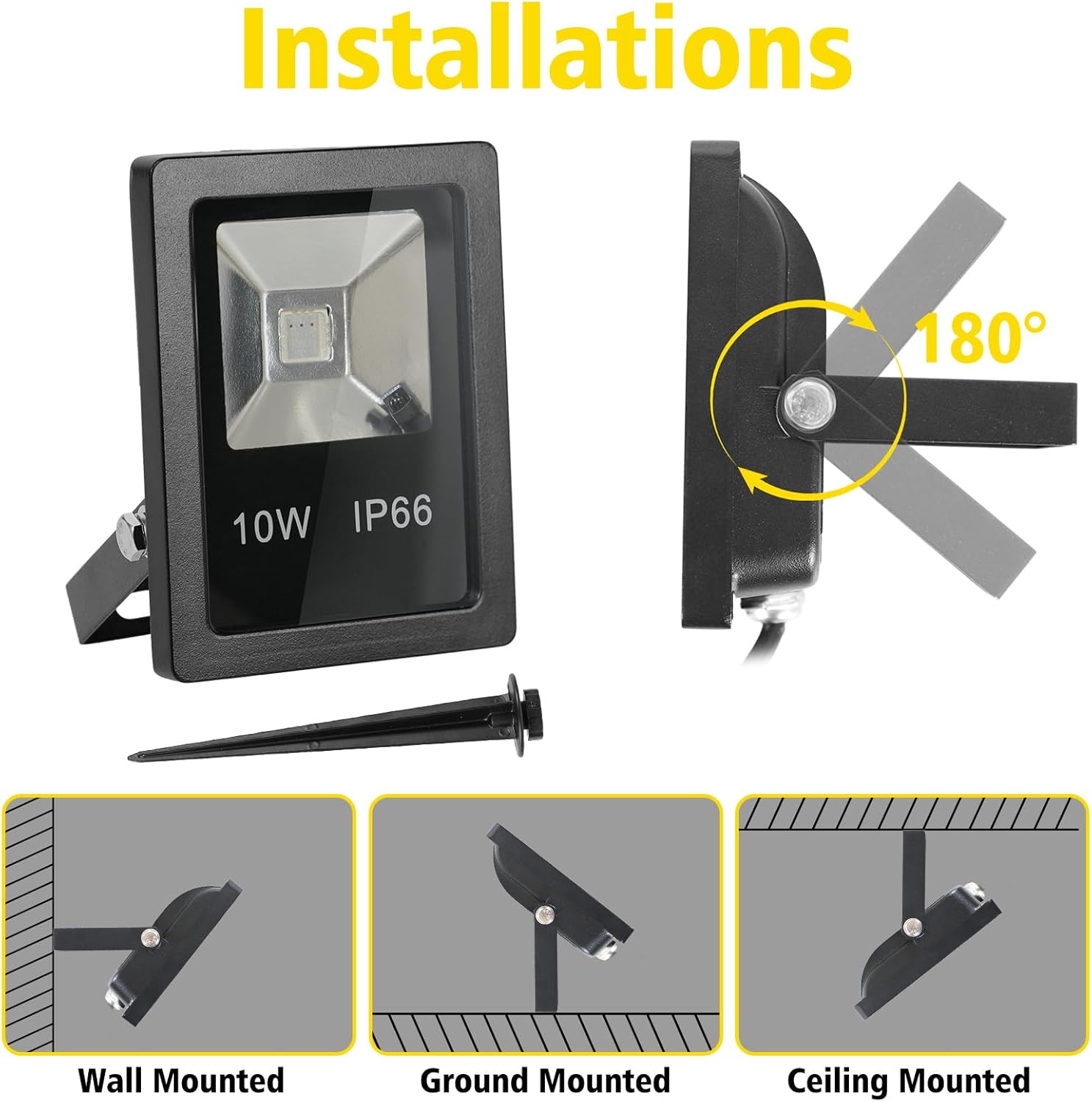 【Install the Lights】The 10W led flood light with 180° adjustable lamp body and a bracket, flexible to meet your lighting requirements. It can be mounted at ceiling, wall, ground, etc..