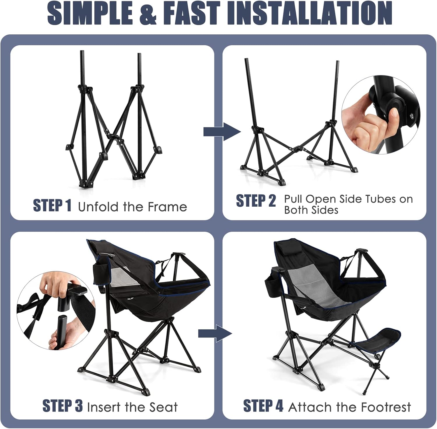 This outdoor camping chair with footrest offers you an ultimately cozy sitting experience with the breathable seat and soft pillow. Additionally, you can select an appropriate angle of the backrest through straps on both sides. The footrest provides extra support for upgraded coziness. Put your water bottle in the cup holder and start your outdoor journey right away. Lean back in the chair and feel the joy of swinging a little. The collapsible design with a carry bag allows you to take it home easily for the next trip. And the detachable footrest renders folding easier.