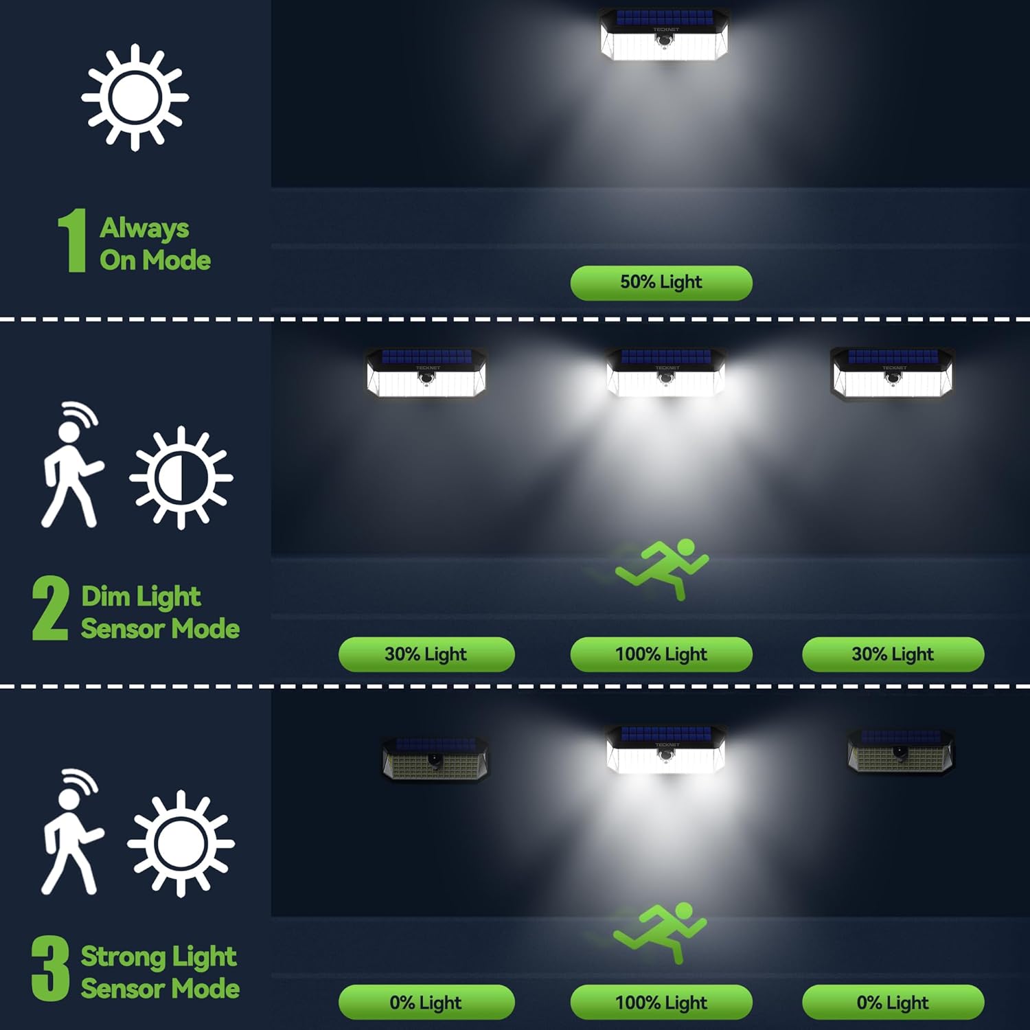 3 Lighting Modes: security lights motion outdoor offer 3 modes to cater to various needs: continuous medium-light for all-night illumination, dim-to-bright light transition, and sensor motion mode (from no light to high light). When you select the always-on mode, the light will turn on at dusk and go off after dawn, allowing you to judge the time by the light. When you use the motion sensing mode, you can save the power of solar motion lights outdoor and extend the working time of light.