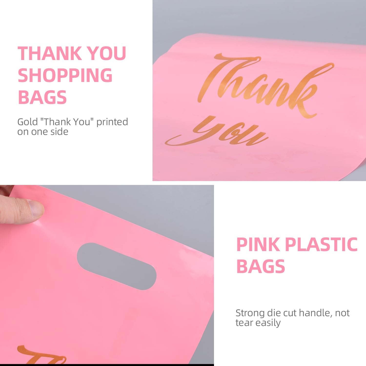 Thank You Bags with Handles: With sturdy die-cut handle design, RainTick business merchandise bags for customers are easy to carry. These pink plastic shopping bags with handles are tear-resistant, provide a firm but comfortable grip without over-stretching or breaking, they can be applied for many times