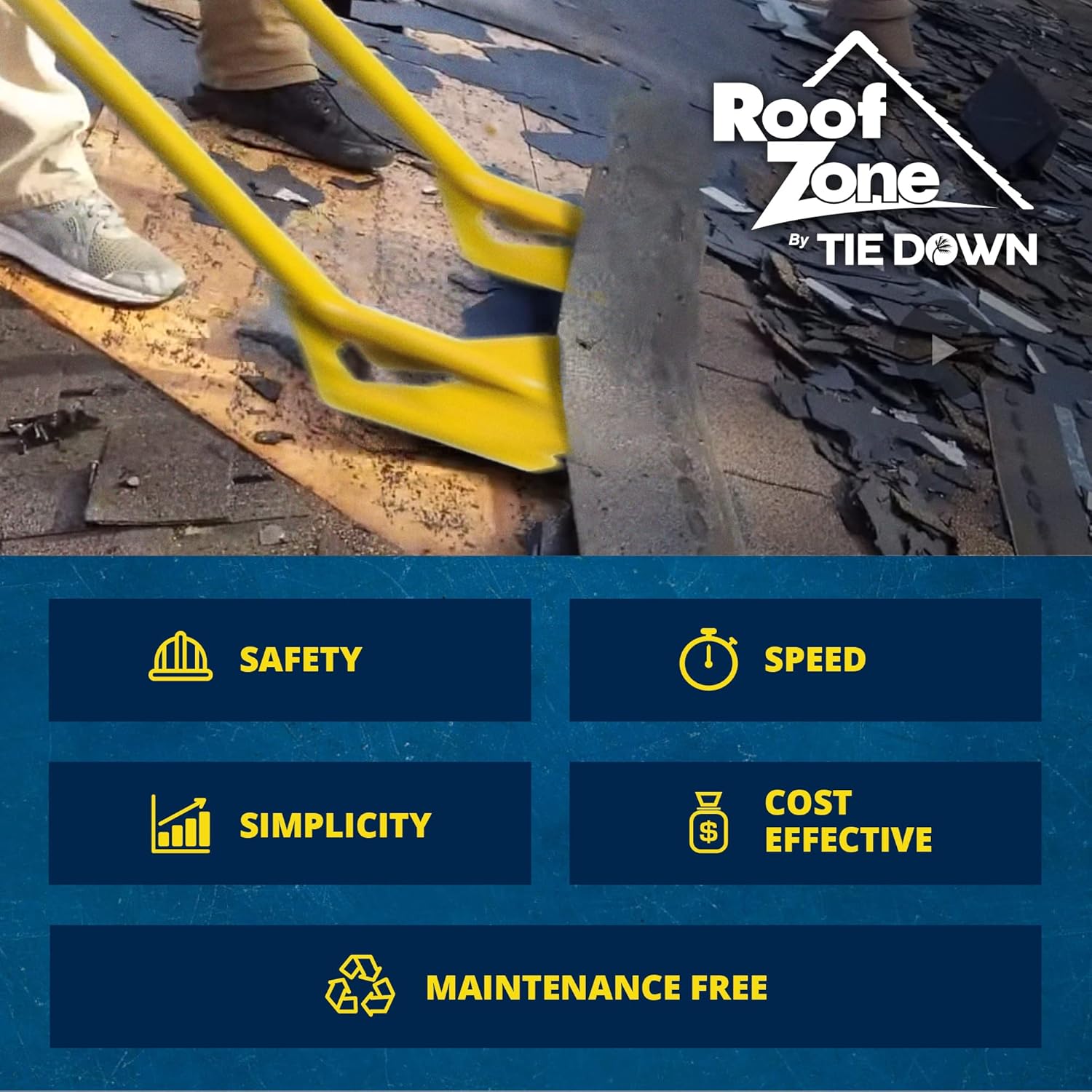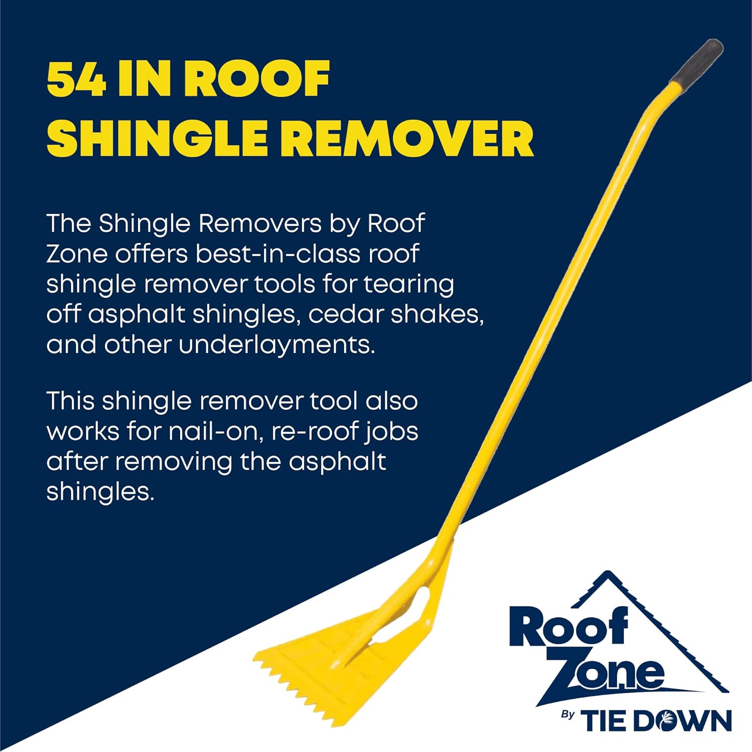 The Shingle Removers by Roof Zone offer a best in class roof shingle remover tools for tearing off asphalt shingles, cedar shakes, and other roofing underlayments. This shingle remover tool also works for nail on, re-roof jobs after the asphalt shingles have been removes. Roof Zone manufactures the 54” Roof Shingle Remover with teeth for pulling both shingle tabs and roofing nails. Available in three difference sizes to assist with harder to reach areas and steep roof pitches. Tie Down Safety maintains high standards and quality control through quality raw materials and components made in the USA.