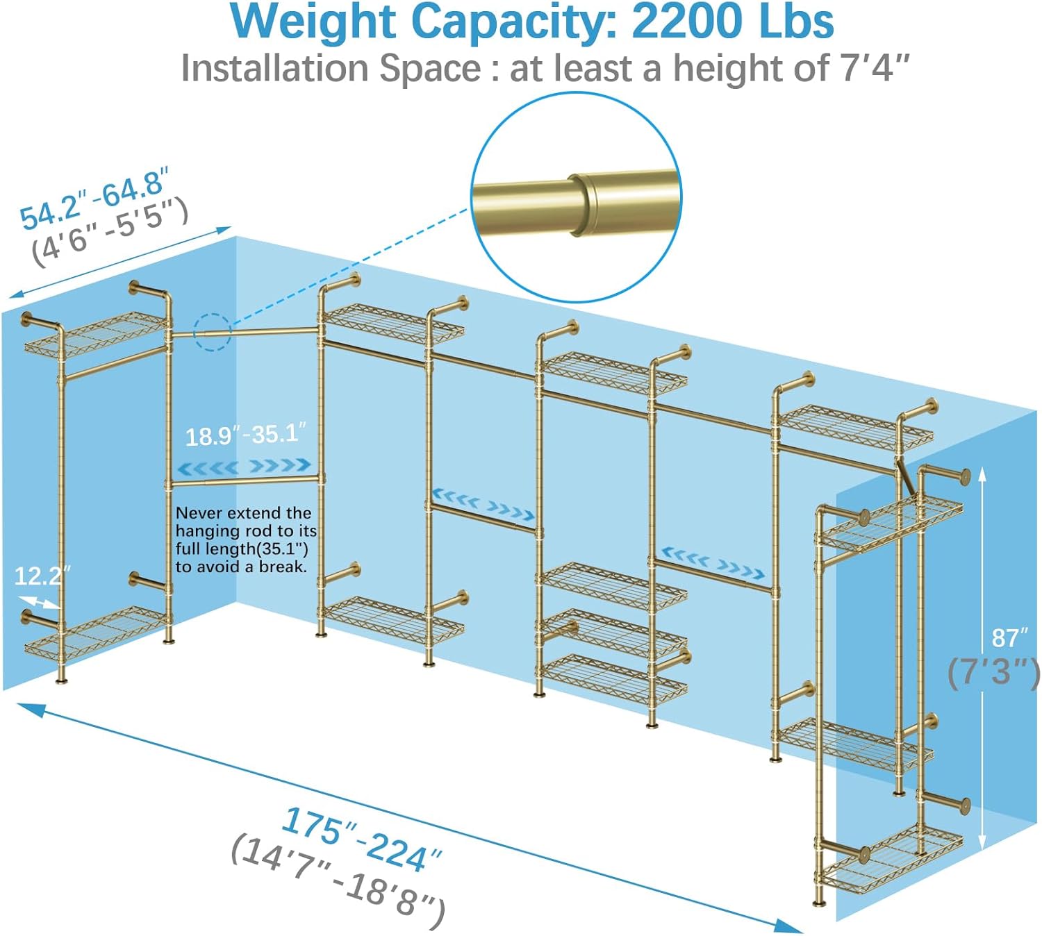 Timate U4 U Shape Garment Rack Heavy Duty Clothes Rack for Hanging Clothes, Expandable Industrial Pipe Clothing Rack Wall Mounted Closet Extra Large Closet Rack Walk in Closet System, Closet Kit Gold