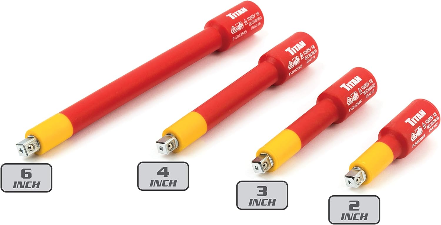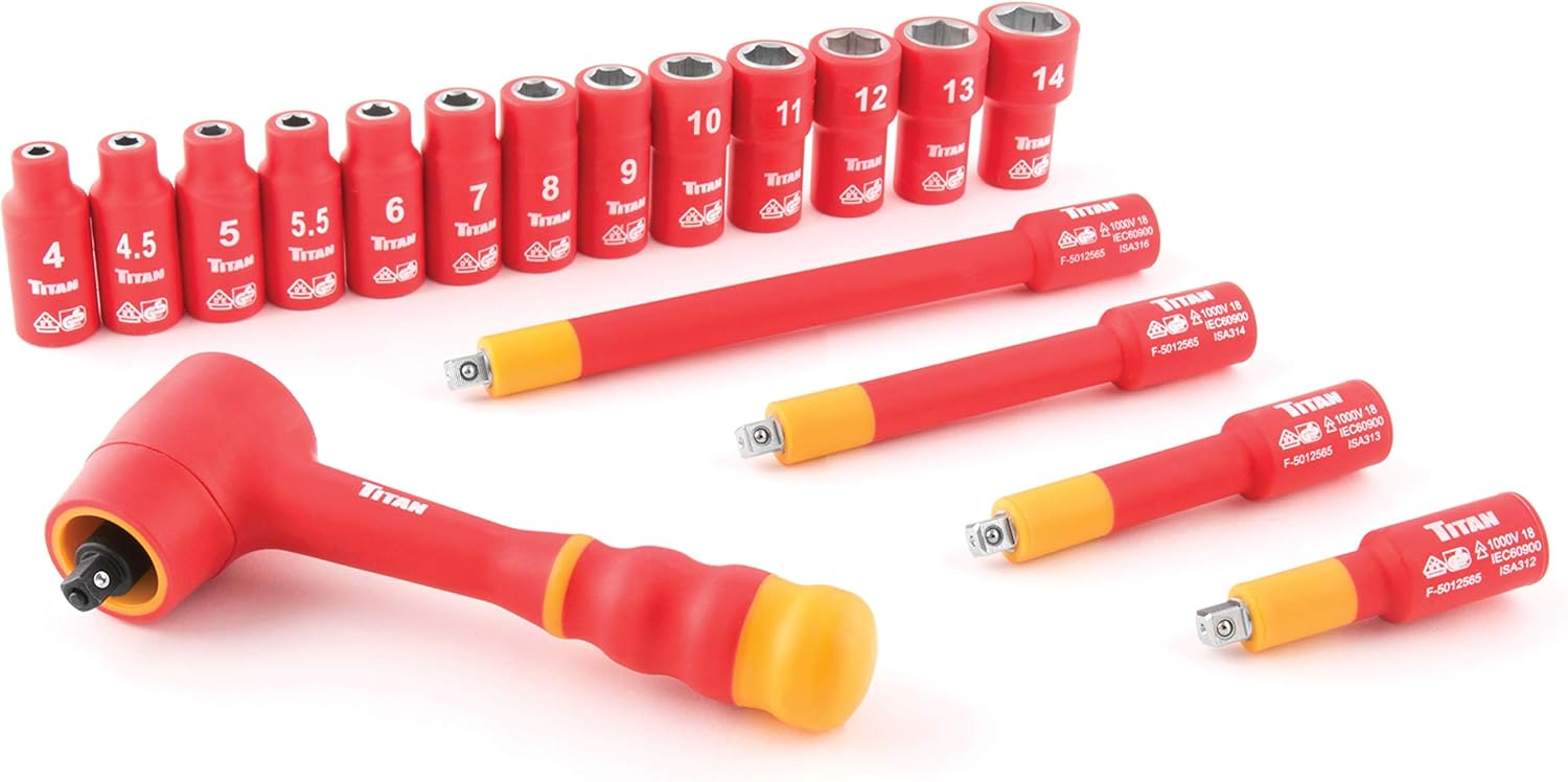 Titan 18-Piece 1/4-inch drive VDE insulated socket set features an array of VDE insulated sockets and extensions and one VDE insulated ratchet. Manufactured to DIN standard and individually certified to EN 60900 and components carry GS/VDE certification and tested and Certified to 1000 vac. Items are also PAHs free.