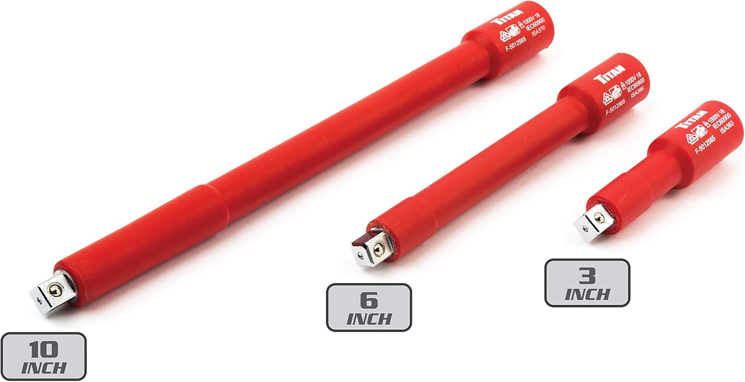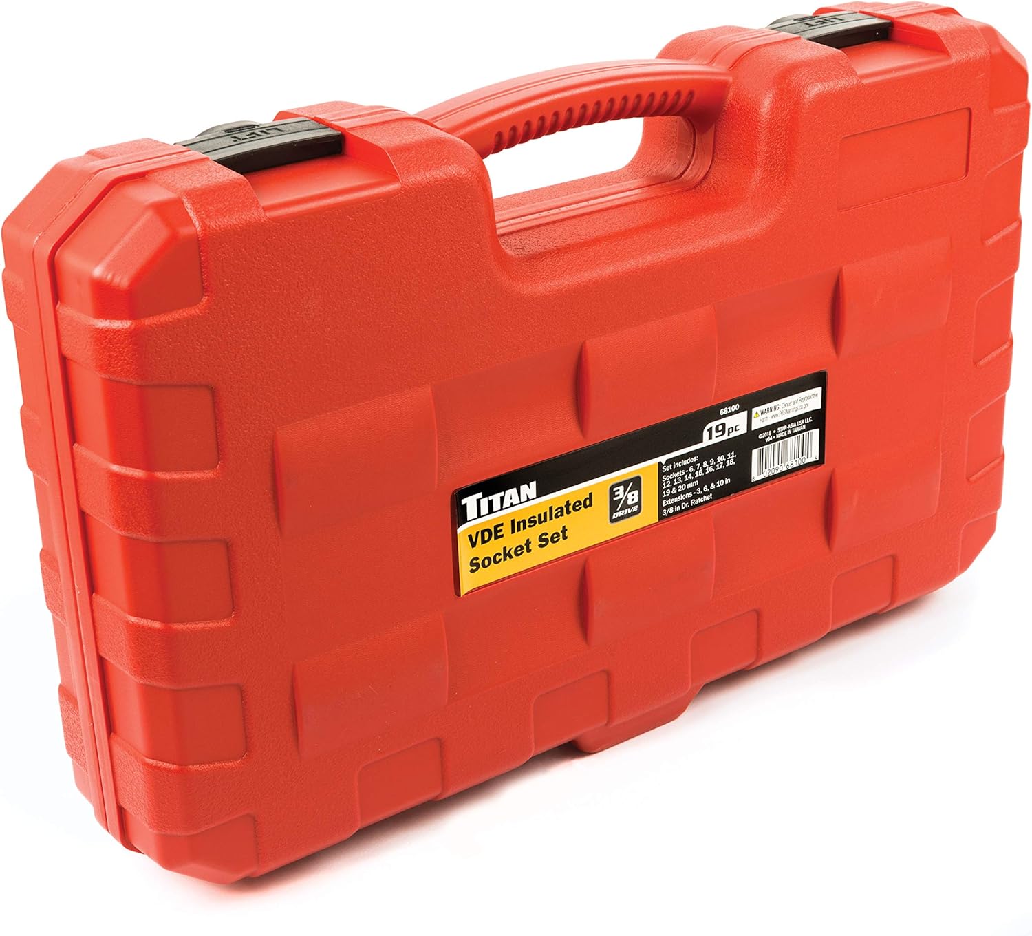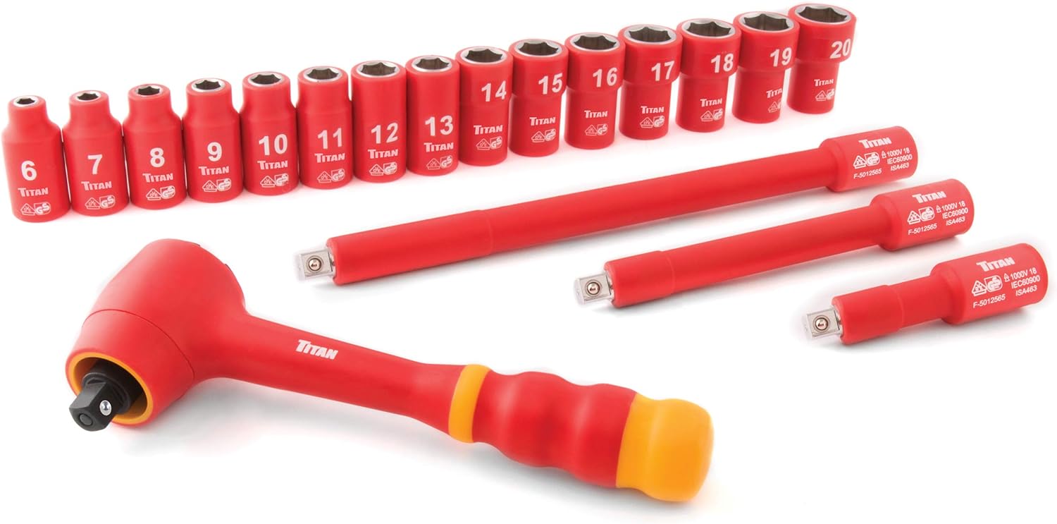Titan 19-piece 3/8-inch drive VDE insulated socket set features an array of VDE insulated sockets and extensions and one VDE insulated ratchet. Manufactured to DIN standard and individually certified to EN 60900 and components carry GS/VDE certification and tested and Certified to 1000 vac. Items are also PAHs free.