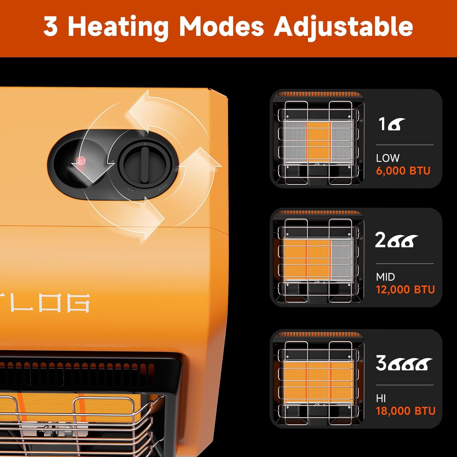 3 Heating mode adjustable – TLOG propane heaters provide 6,000,12,000 or 18,000 btu per hour and can be used with propane tanks weighing up to 20 pounds using gas regulators and hoses. You will feel free to adjust the gas knob to select the desired temperature. In low setting mode (6000 BTU), a 20-pound propane tank is used for up to 69 hours of operation.