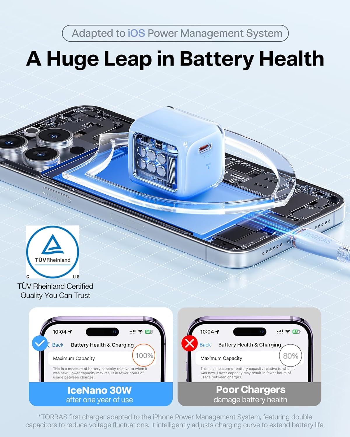 【TÜV-Certified Torras-ice Tech】Powered by GaN3.0 and SuperConductive Fin Technology, the IceNano achieves 3x higher heat dissipation than traditional chargers. TORRAS’ innovative AOS (Advanced Overheat Safeguard) system with multi-layer temperature control ensures maximum charging efficiency while prioritizing device safety.