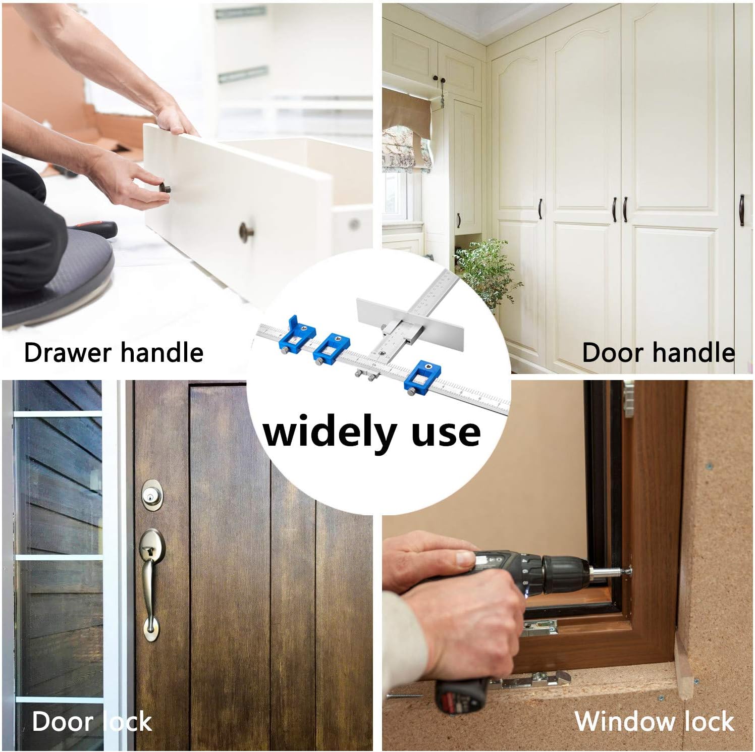 Woodworking Cabinet Handle Hole Locator. The quick-release Drill Guide Block makes set up simple. Front-mounted clamp handle makes clamping easy. Both Inch and Metric units measuring. Improve for inch Scale. Stop-Collar Setting Block makes drill bit setup easy. Anti-corrosion and oxidation resistance. Includes both Inch and Metric Measurement Units. Detachable and portable, can be split into small parts, convenient to carry.