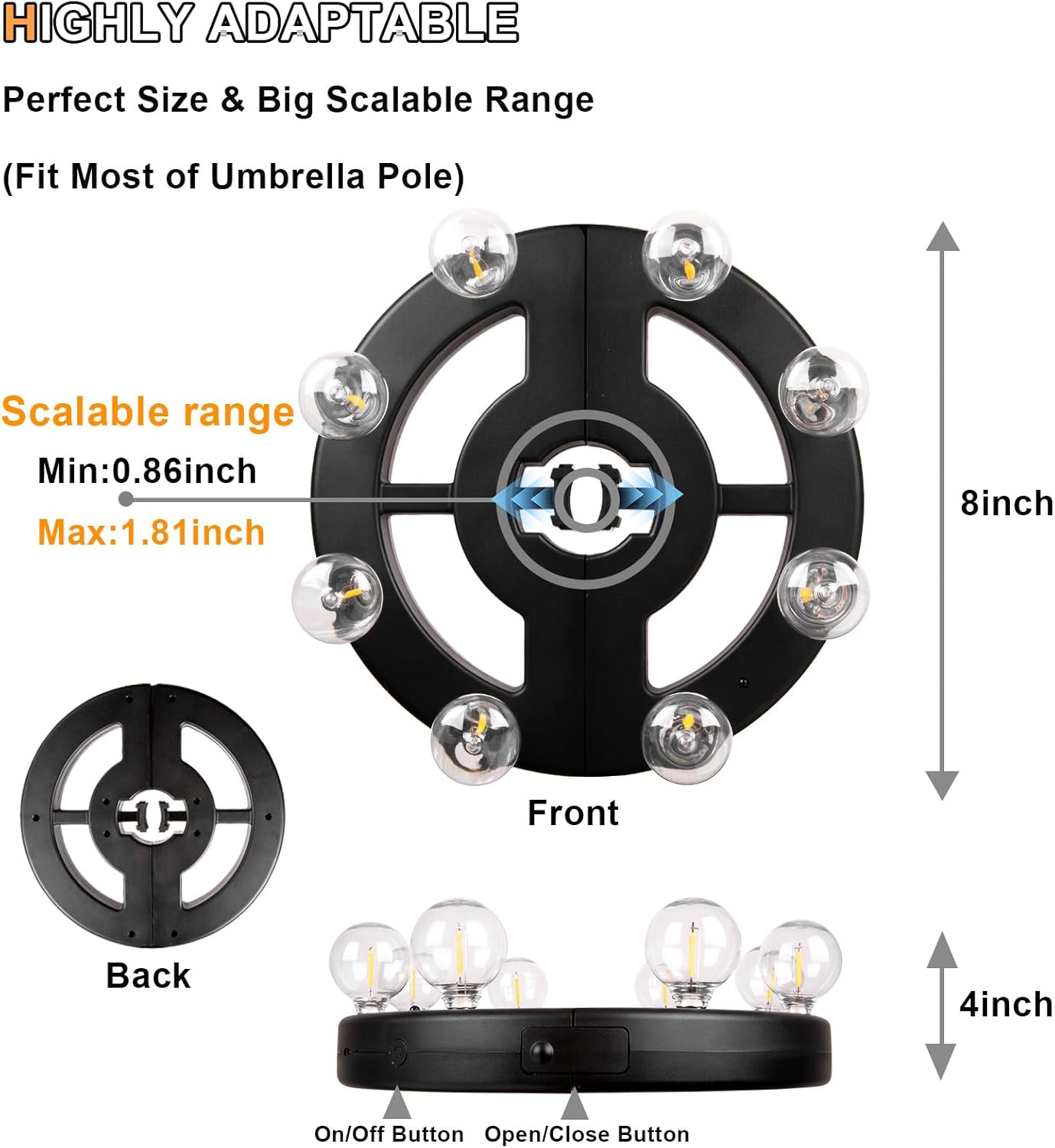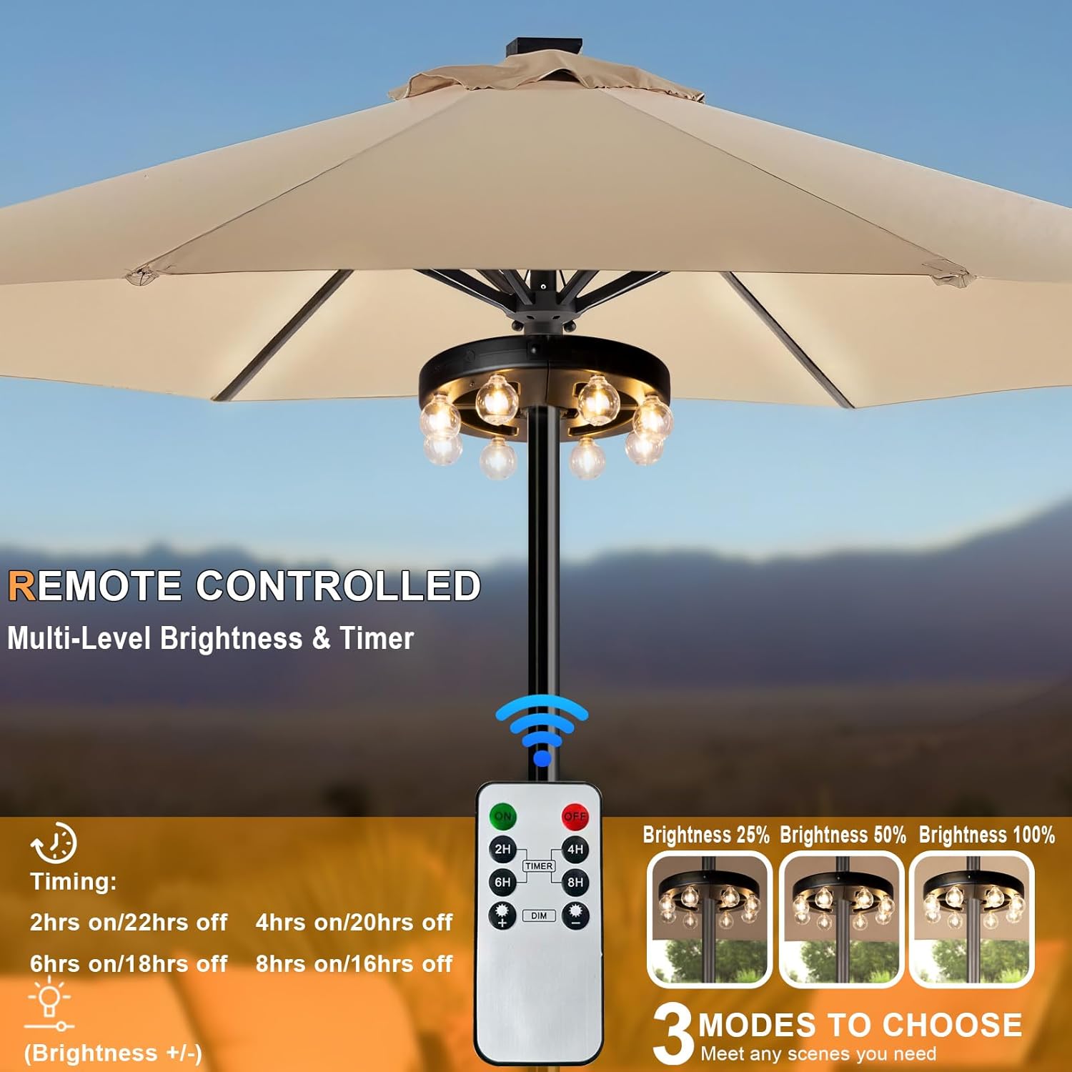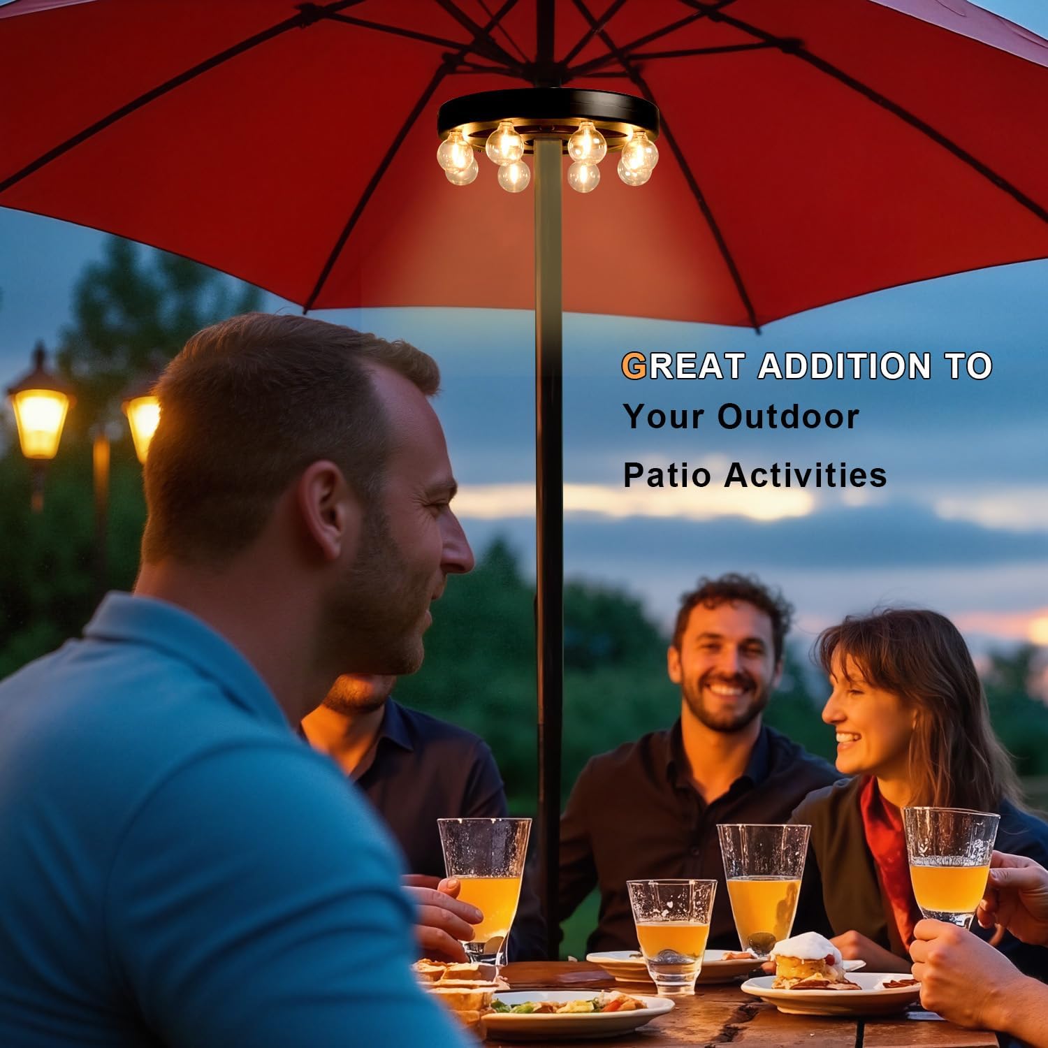 Umbrella Lights Outdoor Patio, Rechargeable Cordless with Dimmer &Timer, 8 Bright Warm White LED Bulbs Perfect for Garden, Backyard, Camping, BBQ or Indoor Use