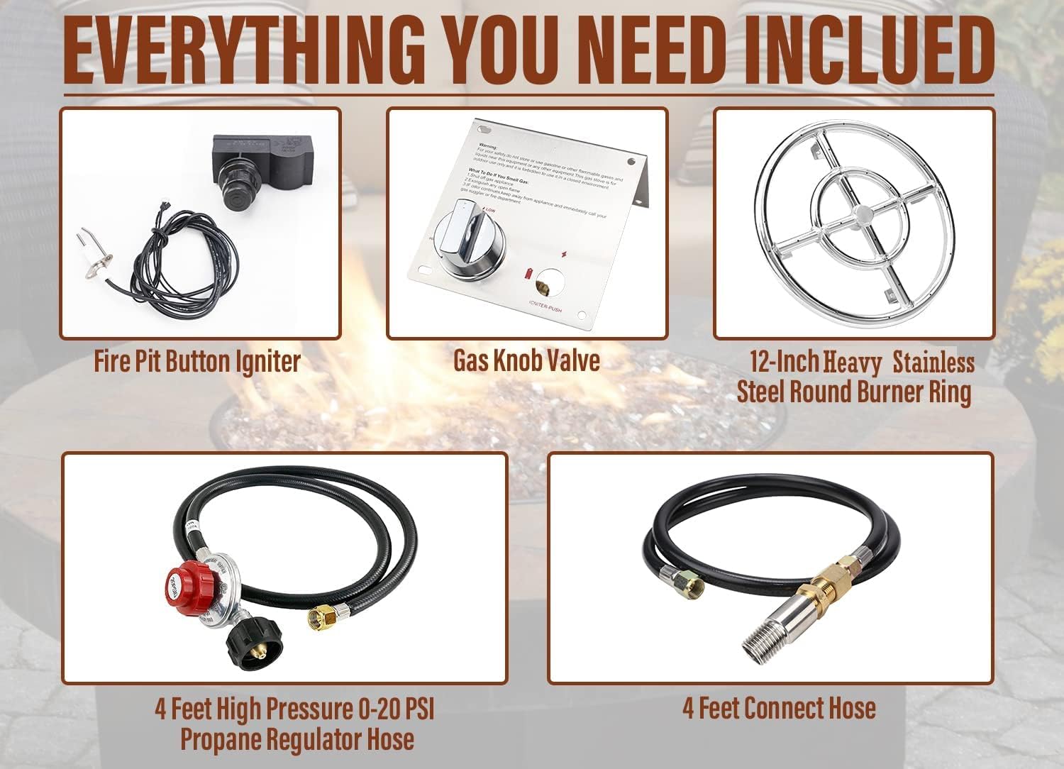 Fire Pit Kit, include:1×12″ Round burner + Sealing TapeFire Pit Installation Kit,include: 1/2″ Shut-Off Valve + 4 feet connect hose + 4 Feet High Pressure 0-20 PSI Propane Regulator Hose + 1/4 chrome Qtr-Turn key valve+ 1/2″ connect threadFire Pits Spark Igniter Key Valve Kit ,include:Gas Knob Valve + Push Button Gas Igniter (battery not include)+ Wire Ignition