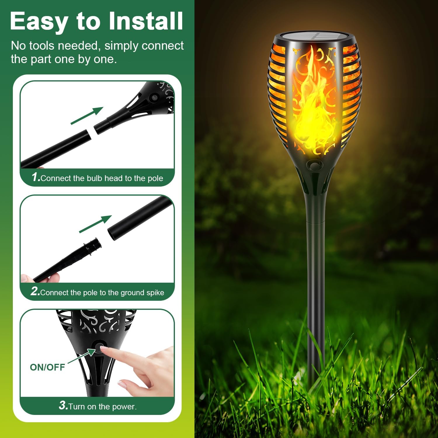 Solar Power Auto ON/OFF: Solar powered outdoor lights which collects solar energy during the day when direct sunlight all day; Automatically turns on the light at dusk and off at dawn; Solar flame lights can provide 8-10 hours lighting when fully charged