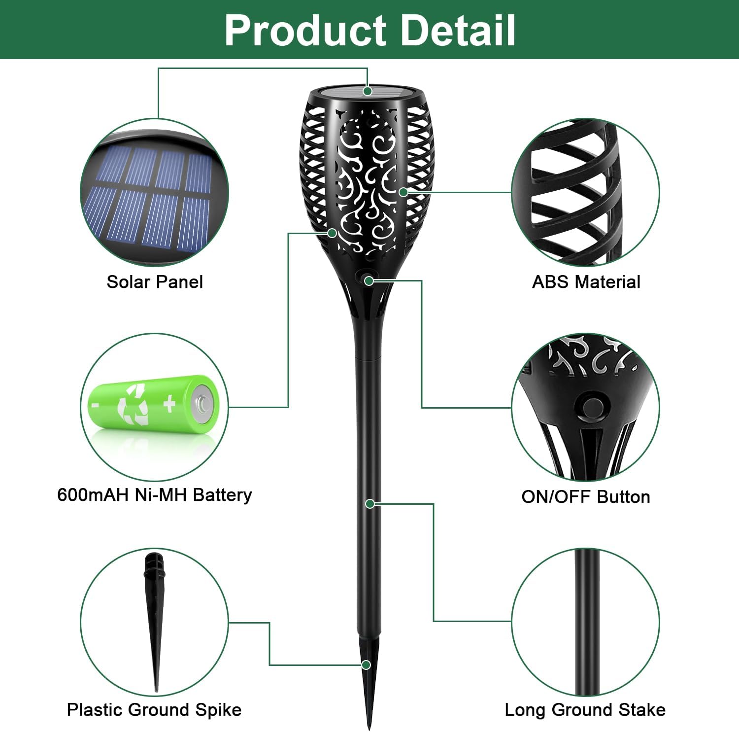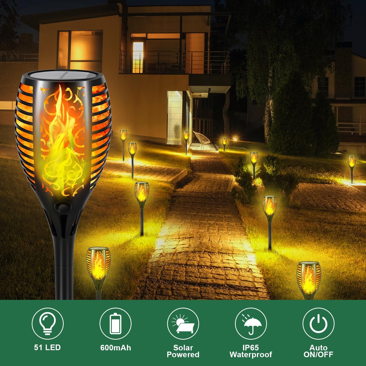 Upgraded Torch Lights with Flickering Flame: Solar lights for outside is safe alternative to the real “flame” effect because of brighter 51 LEDs; Solar torch lights are fitting outdoor decor for garden, lawn, yard, porch, party, camping, BBQ and different festivals