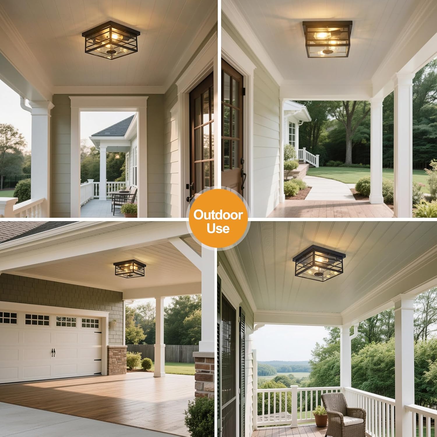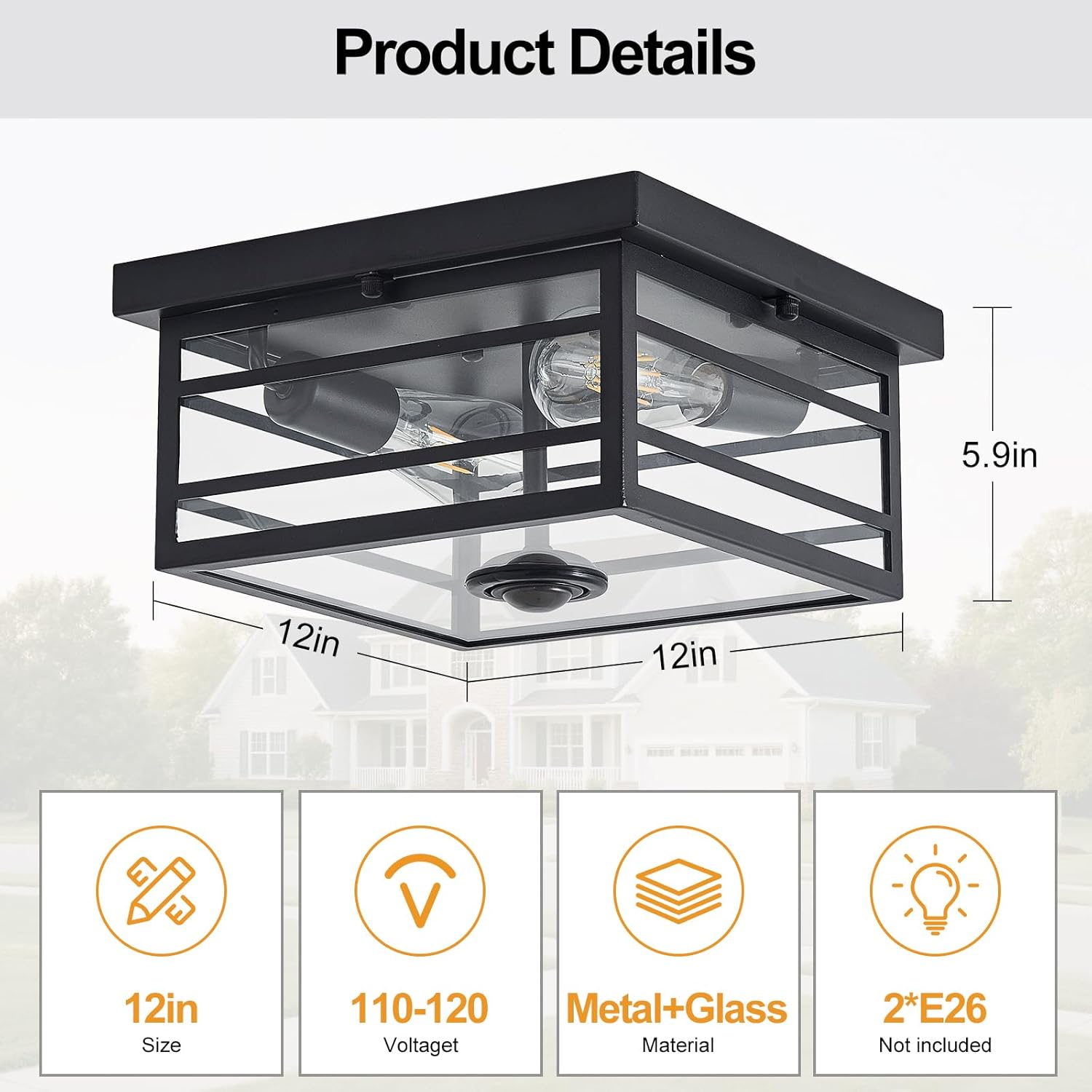 Dimensions and Compatible Bulbs: This exterior ceiling light’s dimensions 12 in x 12 in x 5.9 inches, it comes with E26 sockets (bulbs not included),We recommend using bulbs with a maximum power of 40W for energy-saving and bright lighting.
