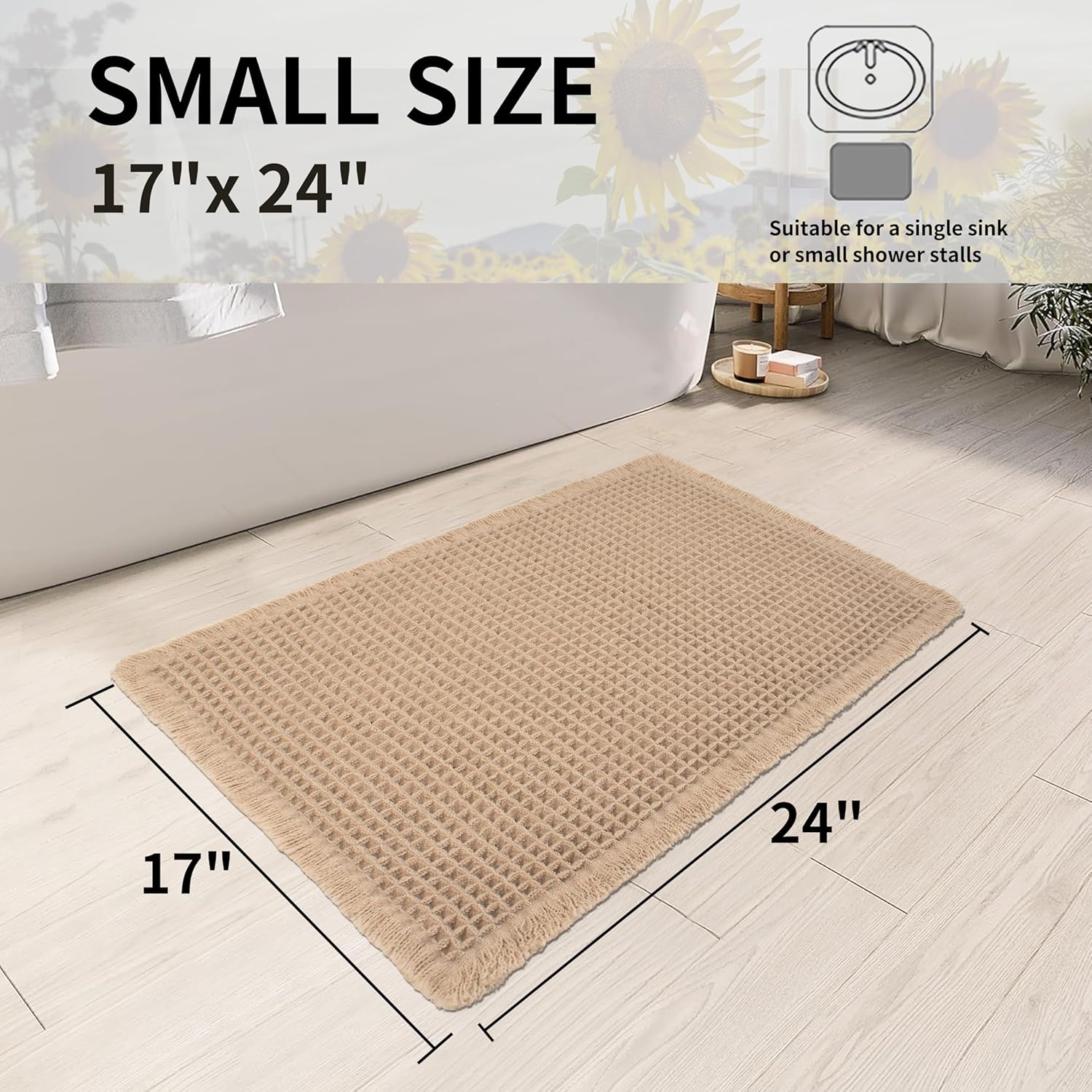 Upgraded Waffle Bath Mat Super Absorbent Non Slip Boho Bath Mats for Bathroom Floor Machine Washable Bathroom Rugs with Tassels Rubber Backed Bathroom Mats Ultra Soft Floor Mats 17″ x 24″ Brown