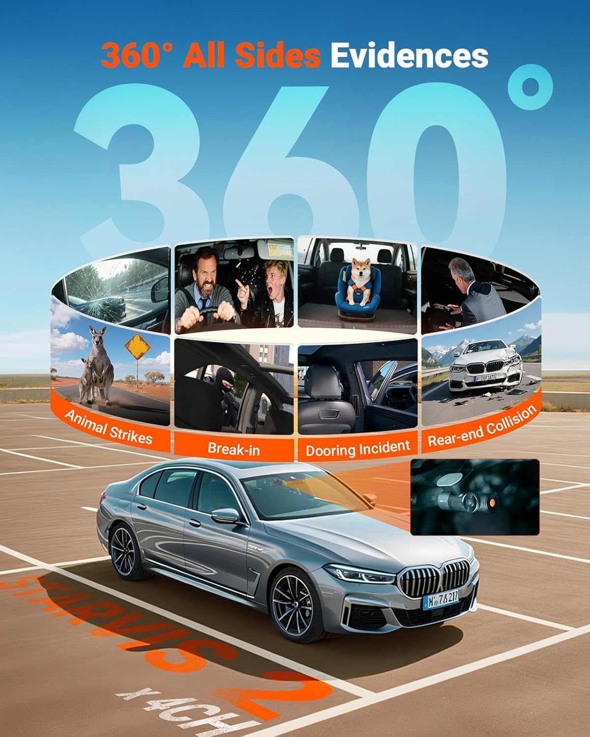 [ 4 Channel 360° Full Coverage ] Experience complete 360° protection with our advanced 4 channel dash cam, eliminating blind spots on the road and inside your vehicle. Featuring a powerful dual-core processor, this dashcam records in stunning 2.7K+1080P+1080P+1440P resolution, with flexible recording modes (1CH/2CH/3CH/4CH) to adapt to any driving scenario. From daily commutes to long road trips, this all-in-one surveillance solution provides effortless driving safety and legal protection.