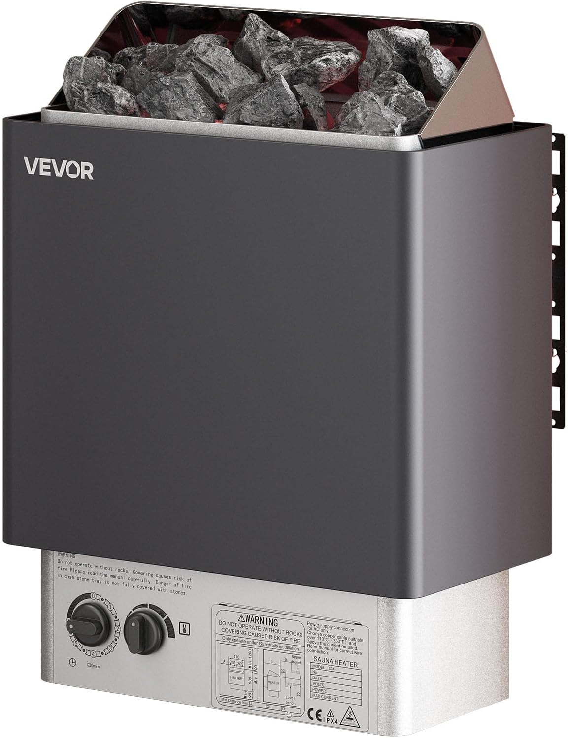 Fast Heating: This heater is 220-240V AC, a special voltage. The site conditions need to be evaluated before use. Power: 6KW; Suitable Sauna Room: 176-318 cu.ft / 5-9 m³; Dimension: 16.1” x 10.6” x 22”. Sauna Stones Need: 33 lbs / 15 kg. Note: Sauna stones are NOT INCLUDED. The ample stone capacity allows the stones to absorb and store heat, ensuring effective heat retention and dispersion.