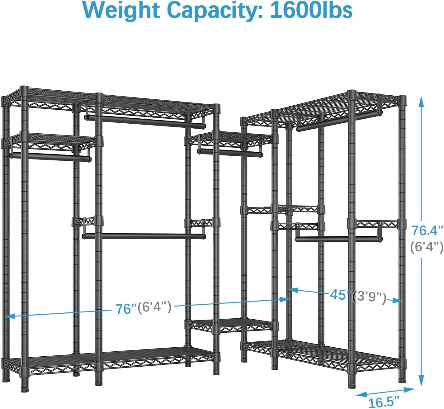 Dimensions & Load Capacity: 76″L x 45″W x 76.4″H, Depth: 16.5″. This heavy-duty wardrobe is made of high quality carbon steel, it features stable and sturdy. Load capacity up to 1600 lbs.
