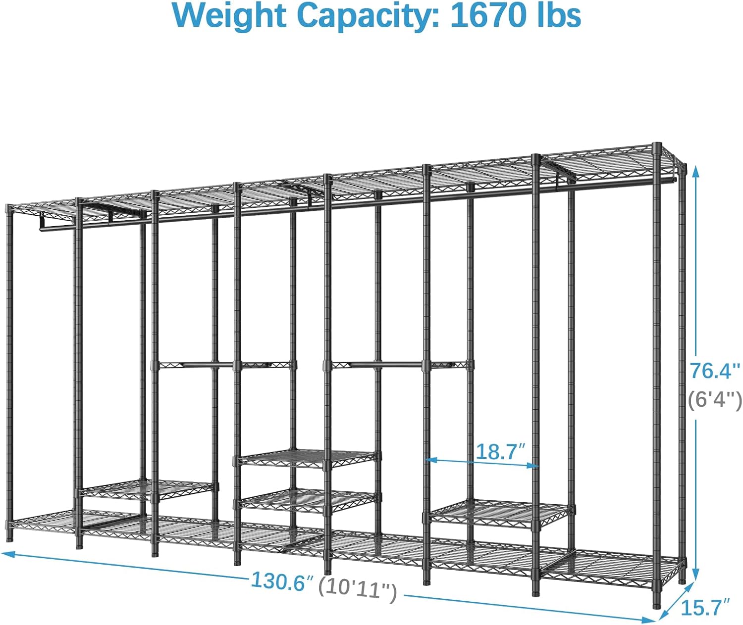 SPACIOUS DESIGN: This clothes rack provides ample space for all your clothing storage needs. Dimensions & Load Capacity : 130.6″ L x 15.7″ W x 76.4″ H. Max Load capacity 1670 lbs.