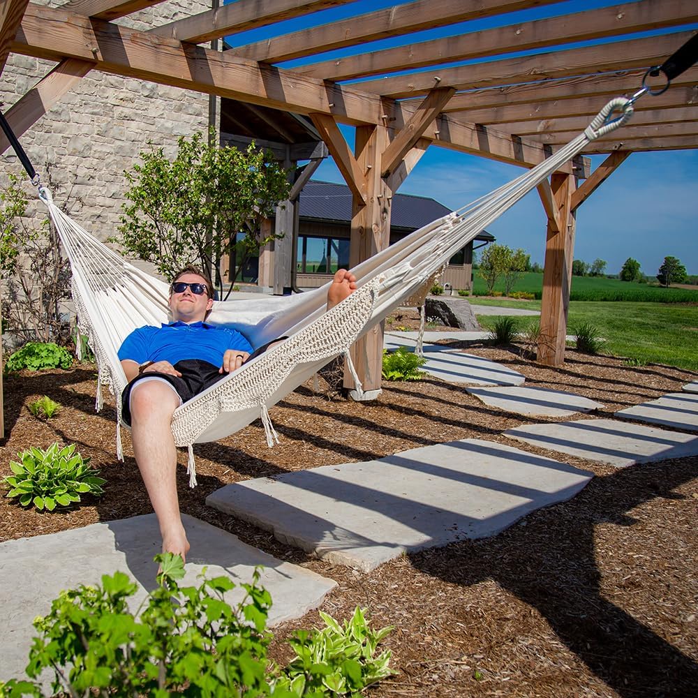 Brazilian hammocks offer the ultimate form of comfort and relaxation. These hammocks are tightly woven with high quality colorfast cotton thread to prevent colors from running. A natural choice for a Caribbean experience. Includes a zippered carrying bag. The hammock bed is 95 x 63 inches, with a total length of 156 inches. Accommodates two adults. 450 pound capacity. Hanging hardware sold separately. Can be used with Vivere #UHS9 universal space-saving steel hammock stand or #EFHTS hammock tree straps (sold separately).