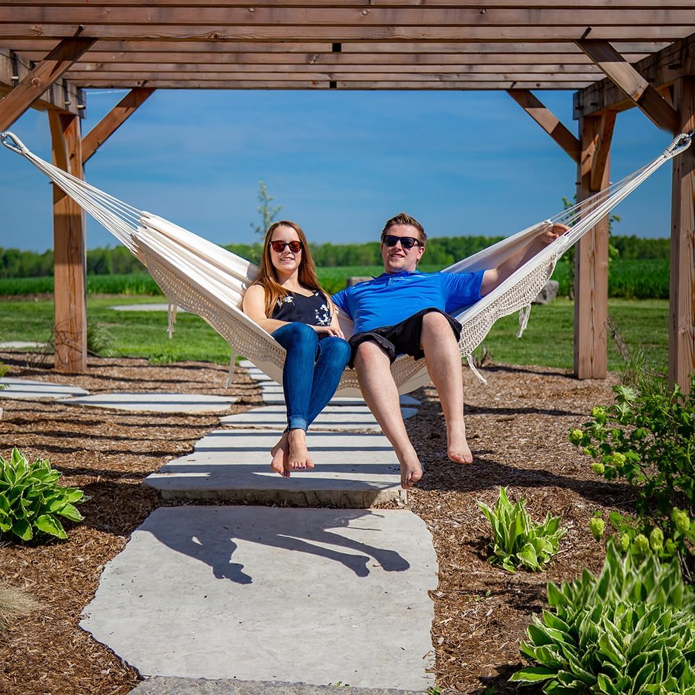This hammock is awesome. My girlfriend and I can fit in it diagonally with no problem. It’s sturdy as hell too. My cats climb all over it and their claws don’t ever leave a mark.