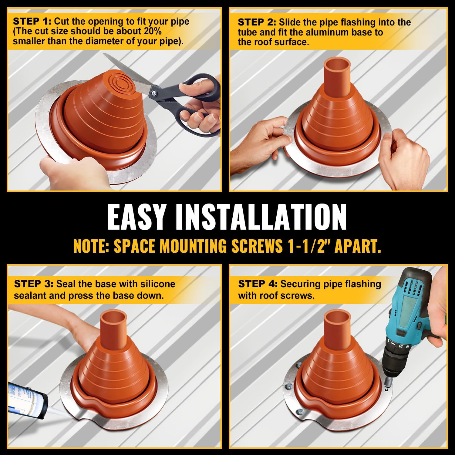 【#3 PIPE FLASHING BOOT】#3 Metal roofing pipe flashing is suitable for 1/4″-5″ OD pipe. The rubber pipe boot can be cut to size easily. Please make sure to buy the right size pipe boot and don’t over tighten screws.