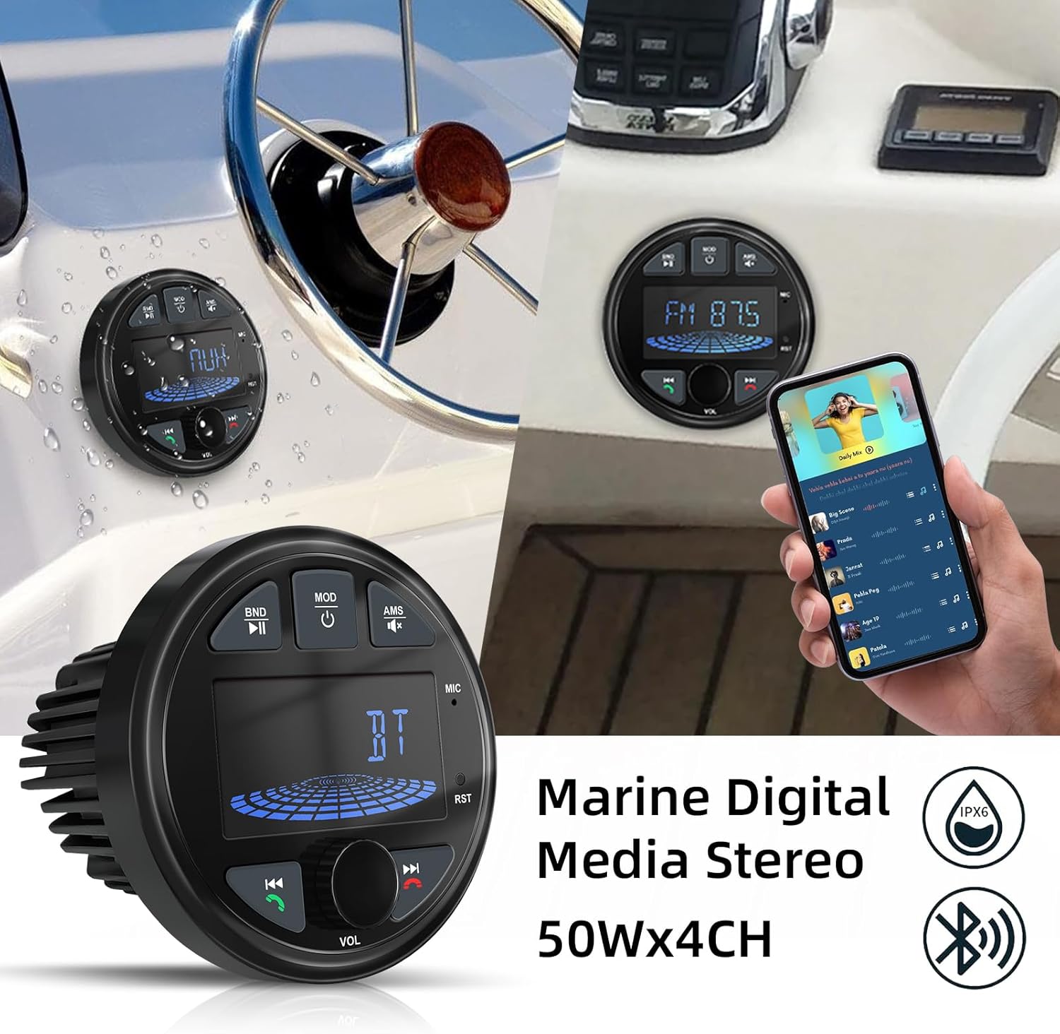 🚢【High‑Power 4×50 W Amplifier】 – Delivers up to drive four speakers with powerful, distortion‑free audio—perfect for boat stereo, utv stereo, and off‑road adventures.