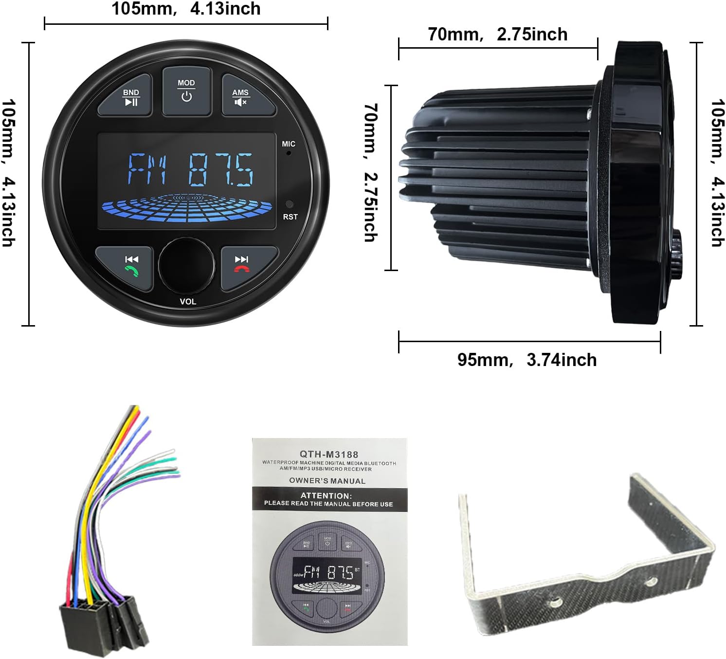 🚢【Ultra‑Compact Gauge Mount】 – Fits boats, yachts, golf carts, UTVs, ATVs, and RVs—complete with labeled harness and hardware for a quick, hassle‑free install of your new marine stereo bluetooth.