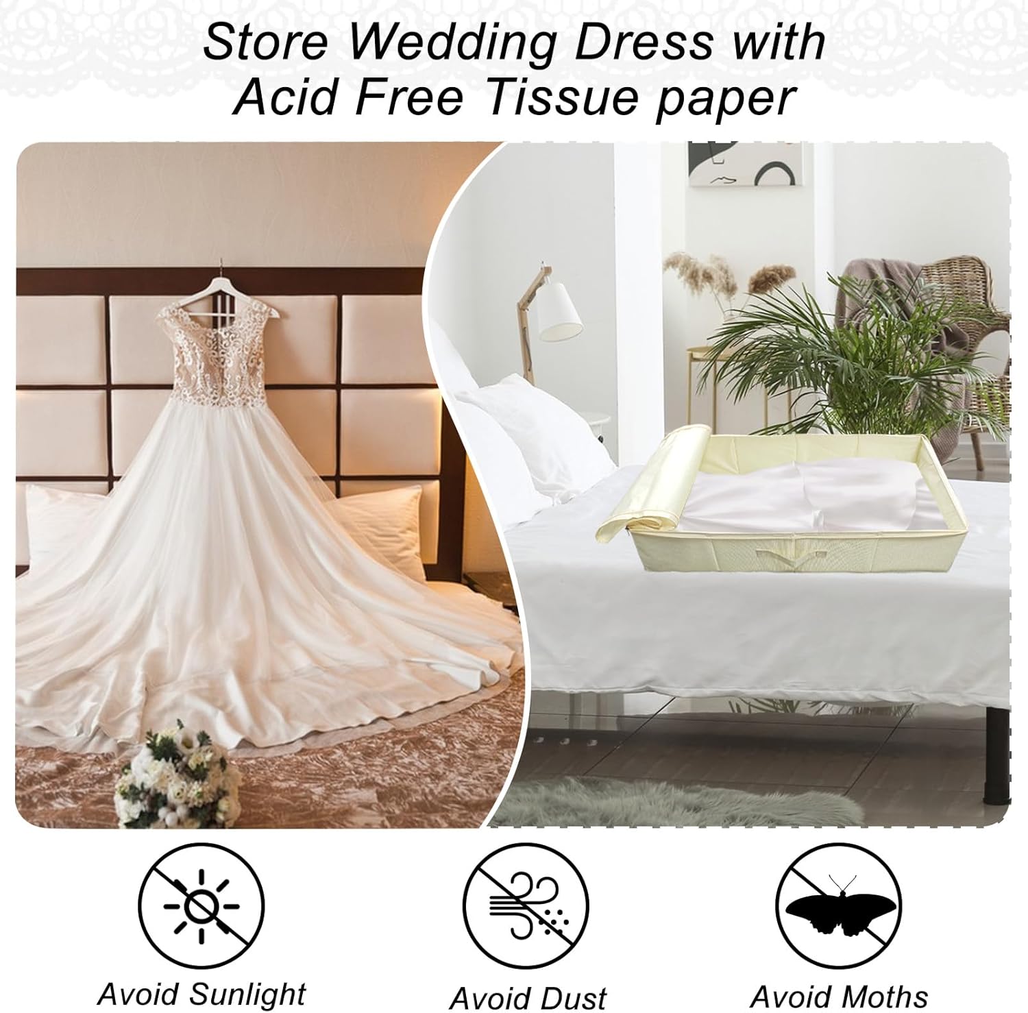 【Wedding dress preservation conditions】No matter what method you use to preserve the wedding dress, it is recommended that you find a place where the temperature does not change much and avoid sunlight, dust and moths from damaging the wedding dress. Therefore, The best place to store your beloved wedding dress is underbed or above the wardrobe. Our size is perfect for both places.