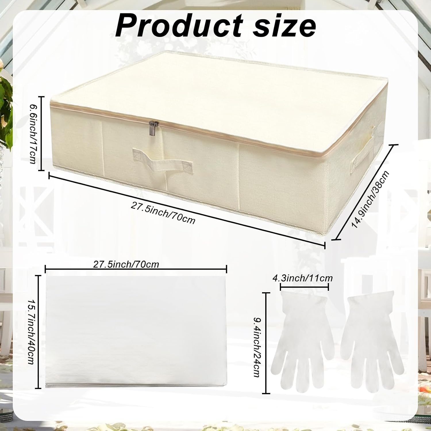 Great product. Very sturdy box. Came with more than enough acid free tissue paper. Gloves are simple and might be too small for anyone with larger hands but fit me. I love that it is made of cotton and breathable. Only concern is the top is just cloth and not reinforced so you wouldnât be able to store anything on top of it but Iâm sure it will fit perfectly under a bed or on a closet shelf. So happy to know my dress will be safe (almost had a coffee spill that seeped under the door of the closet where I kept my dress in a cloth gown bag).