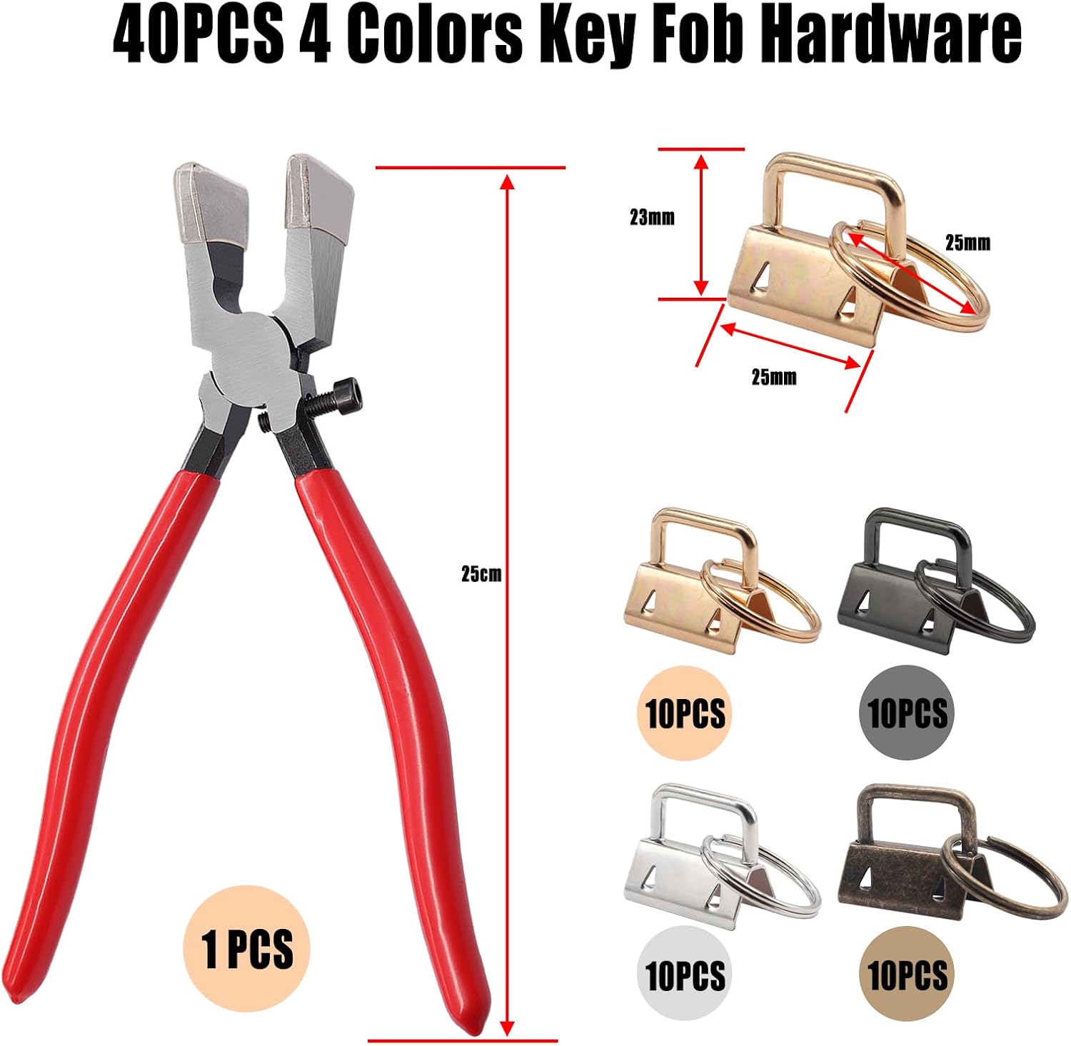 You will get 1Pcs Key Fob Plier with 40pcs 1inch Key Fob Hardware, Including Gun-Black 10pcs, Sliver 10pcs, Bronze10pcs, Golden10pcs.The key fob hardware is made of heavy-duty metal alloy.