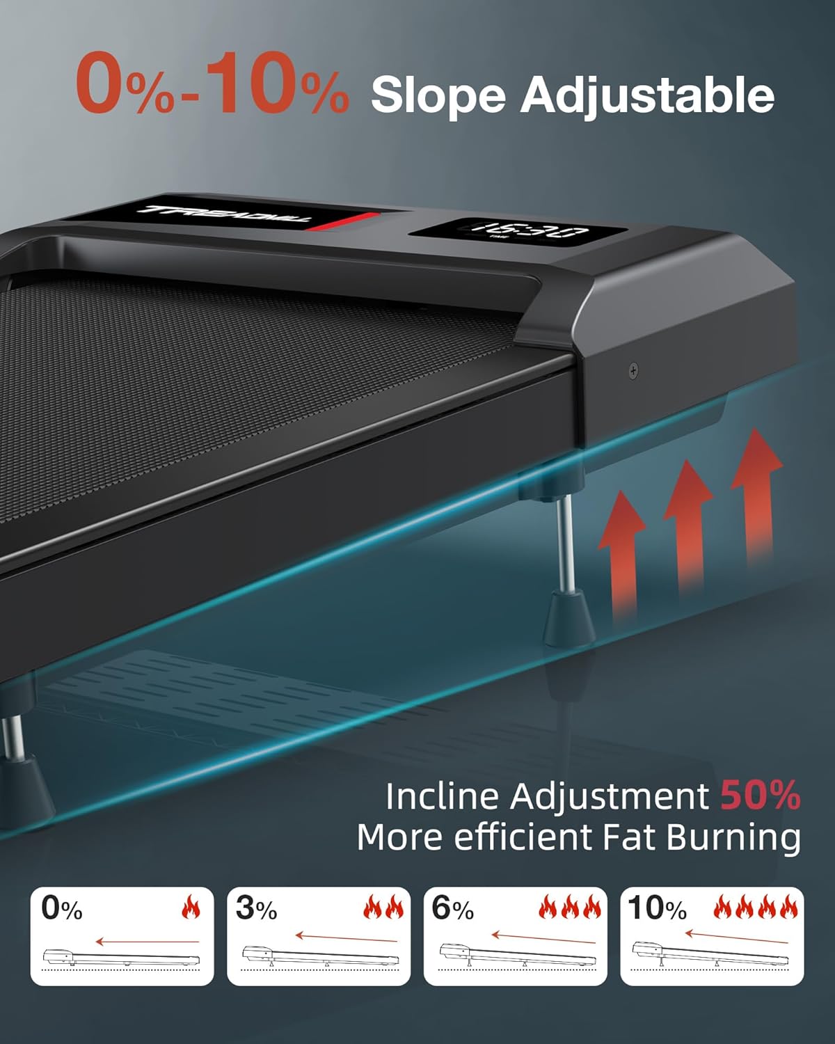Anti-Slip & Shock Absorption Design: The walking treadmill features a 5-layer anti-slip running belt, 8 shock absorbers. These elements effectively enhance anti-slip properties and minimize joint impact during running, resulting in a smoother and more enjoyable workout experience. Additionally, the inclusion of a 10% incline effortlessly helps achieve fitness goals.