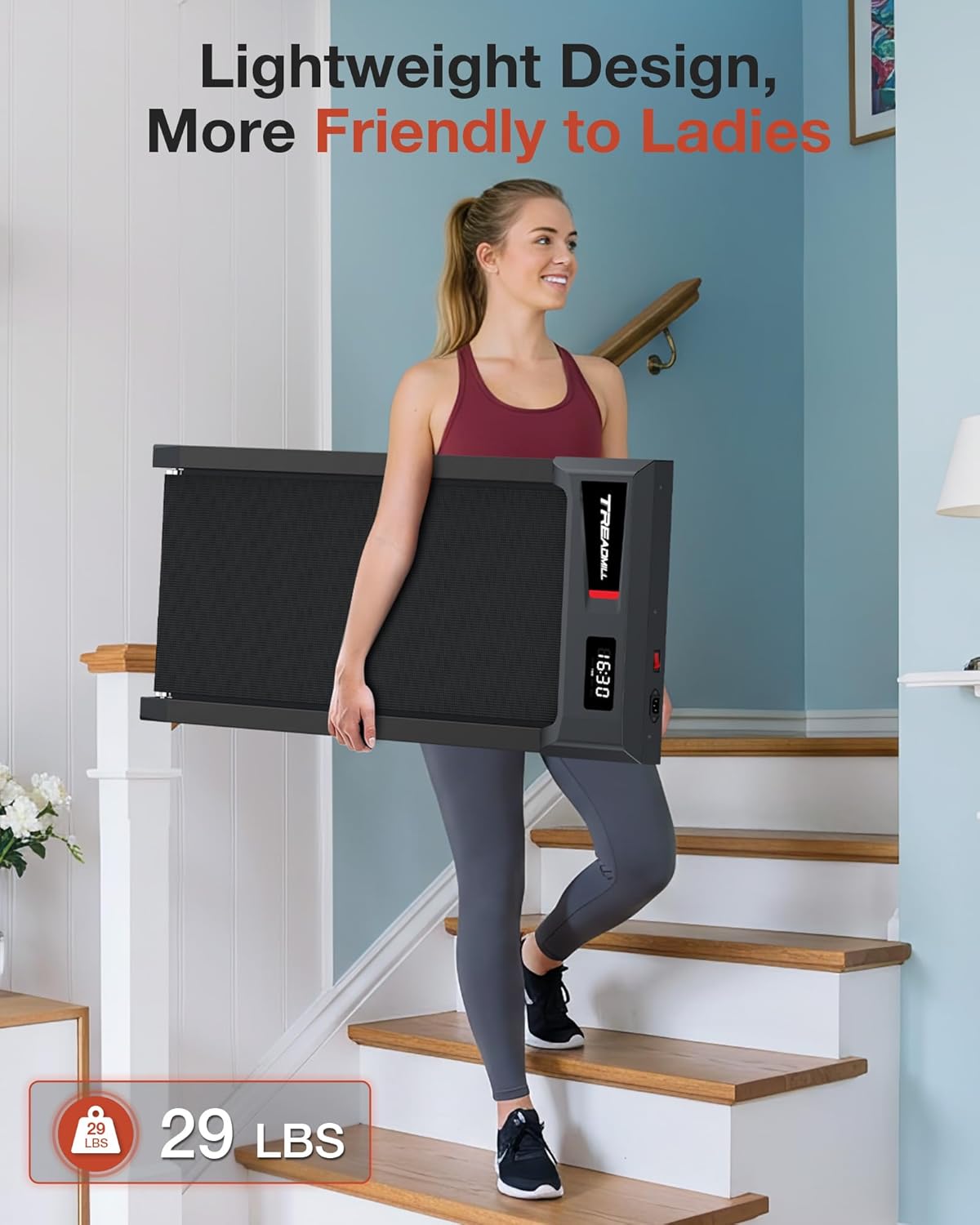 No Assembly & Space Saving: The compact treadmill is ready to use out of the box. With its slim profile measuring only 42.9″ x 17.75″ x 3.46″ and weighing just 29lbs, it can easily fit any limited spaces such as desk, bed or sofa when not in use. The treadmill mat can also be stored vertically. Moreover, the compact design is included to facilitate effortless relocation of the desk treadmill.