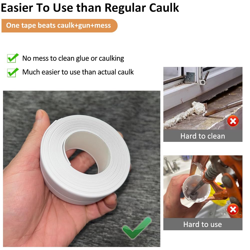 【Wide Applications】:Peel and stick caulk tape is ideal for toilets, tubs, sinks, showers, basins, kitchen countertops, cabinets, backsplash, floor tiles, wallpaper, cooktops, stoves, bath vanity, mirror frame border, baseboard, splash guard, window, wall, door, bathroom decor and accessories. Can be used on tile, vinyl, wood, marble, glass, plastic surfaces. The caulking tool provides a professional look to the bathrooms and kitchens, keeping your house clean and neat for a long time.