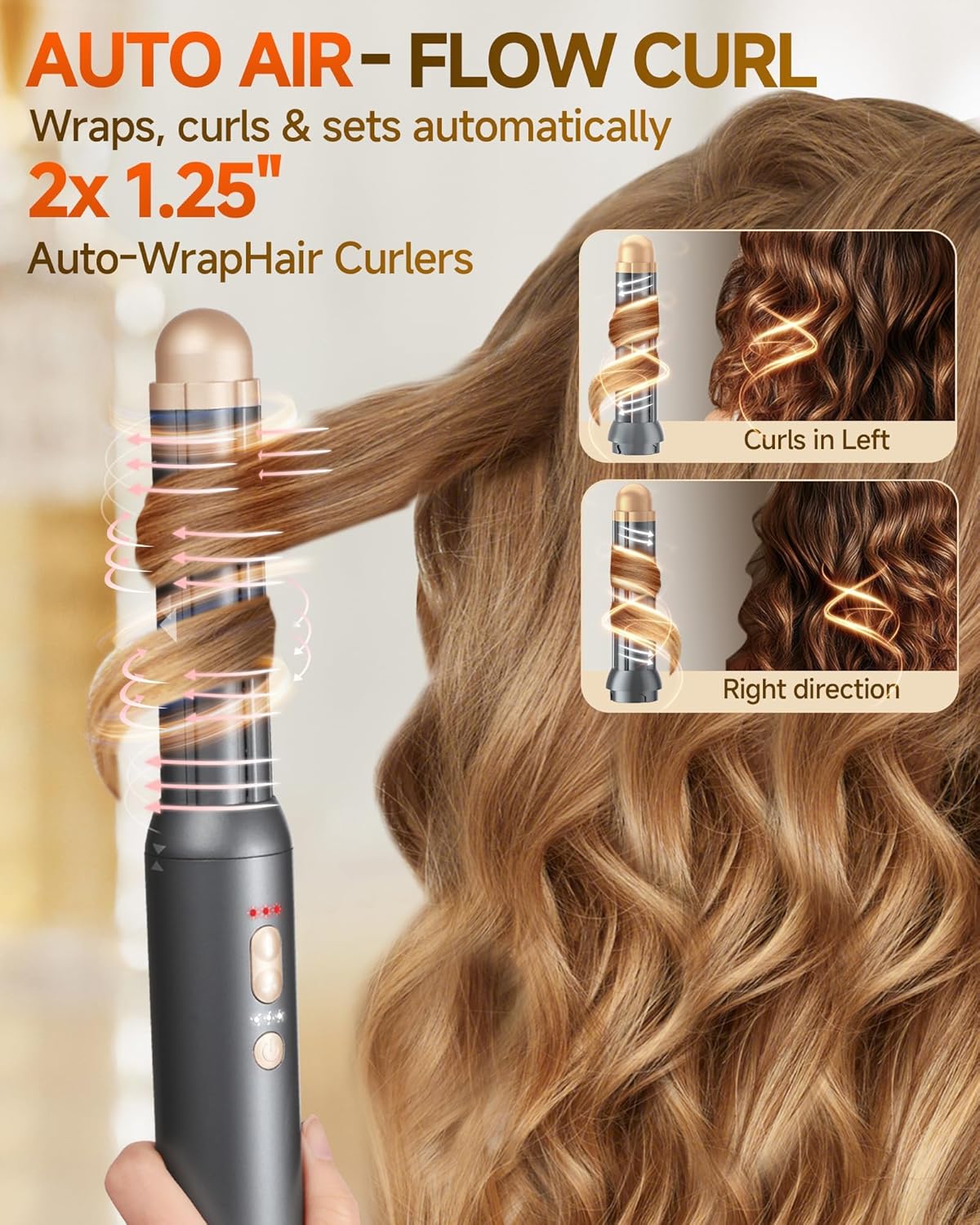 1.25”AUTO WRAP CURLERS: The curling barrels use Coanda technology to automatically wraps spinning curl hair. No skills are required. Totally beginner-friendly. Use the two accessories rollos wraps airflow included curling wand barrels to freely design the hair style for outer and inner curls,creating natural, flex fusion,smooth, and voluminous salon-level natural curls, exuding charming beauty confidence. DIY appliances popular curling cases: mermaid waves/air curls/French waves/smooth C-curls/short waves/retro waves.