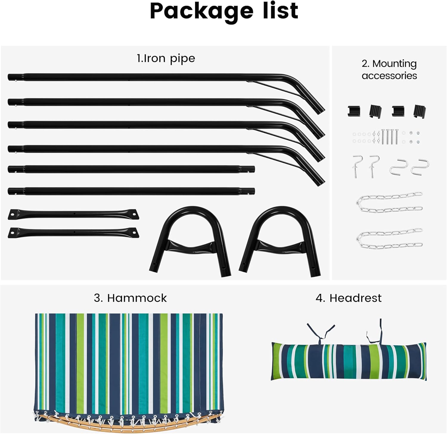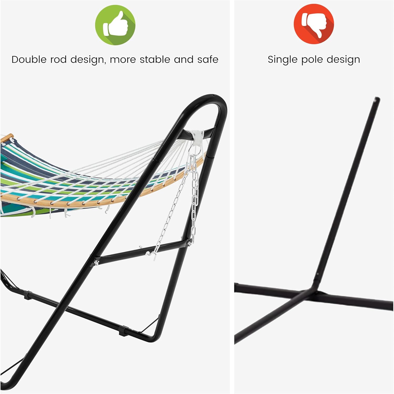Extra-stable Support: The hammock stand, crafted with double iron tubes, is constructed into a triangle structure, with two extra reinforcement bars on each side and a corner strengthening iron bar between each leg and base tube. This hammock-stand set is designed to offer you reassuring support to focus on each happy moment