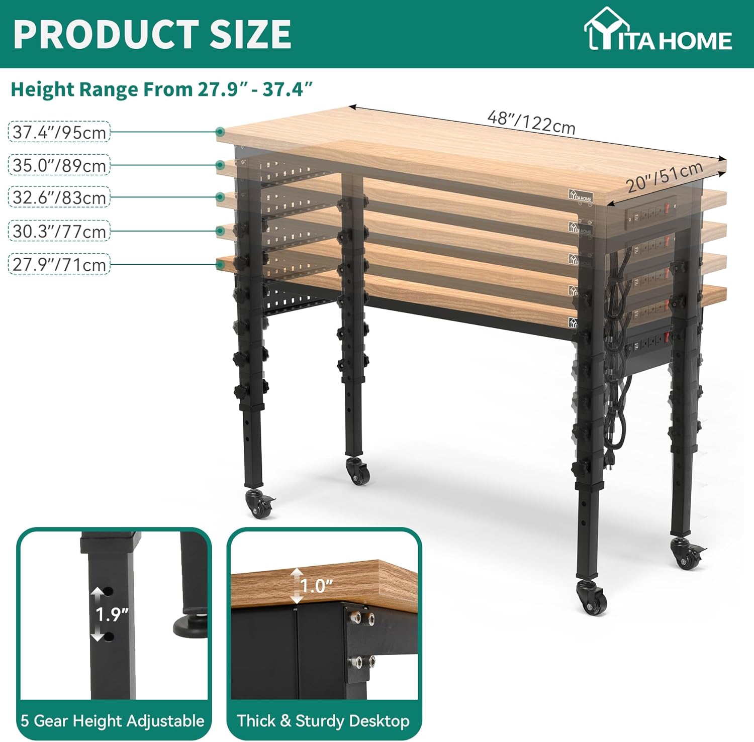 STURDY & DURABLE – Adjustable workbench is designed for heavy usage, featuring a 26mm thick, solid 48″ * 20″ oak-colored desktop; It can support up to 1600lbs and the four adjustable rubber feet enhance stability on the ground, making it a reliable and long-lasting workspace solution