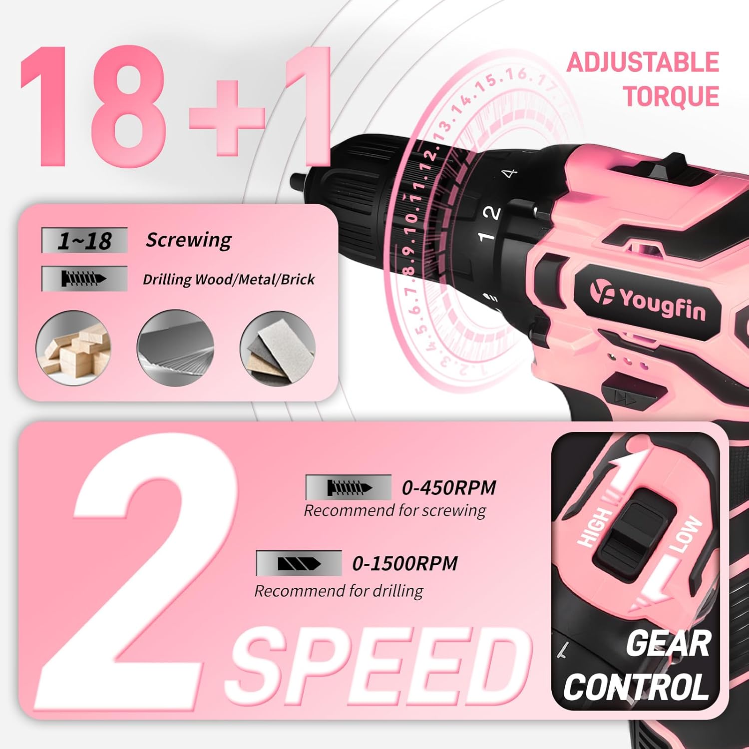 【Versatile with Precision Control】: The drill set for women has 18+1 clutch settings to suit all drilling needs without damaging surfaces. With 2-speed settings and torque settings, you can control the pink drill for larger or smaller fasteners, ensuring precision with every task.