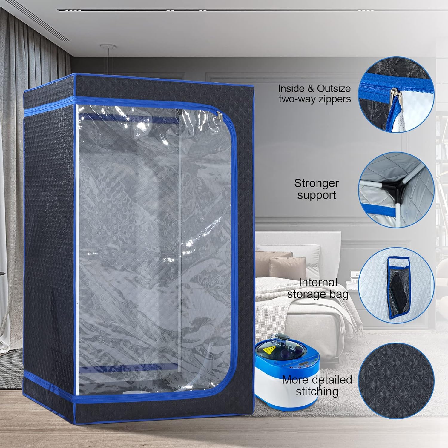 Convenient Design: Even if it is your first time to set the tent, no tools needed, simply fit each metal pole into place and drape the tent around the frame. The bi-directional zipper can be opened from the inside at any time. here is a pocket inside the sauna room that can be used to store mobile phones, towels and other small items. And with remote control, you can easily adjust time and temperature by yourself